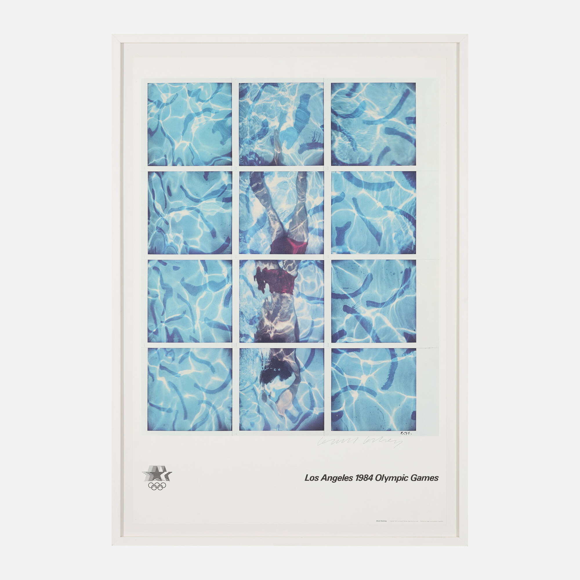 David Hockney's Polaroids of Swimmer captures the spirit of athletic celebration through an offset lithograph in colors created in 1982. The work references the 1984 Los Angeles Olympic Games and the energy surrounding this major sporting event. The Polaroid aesthetic brings an immediacy and casual quality to the representation of swimmers and the Olympic atmosphere. Hockney's use of vibrant color and informal composition reflects his fascination with movement and leisure in California.