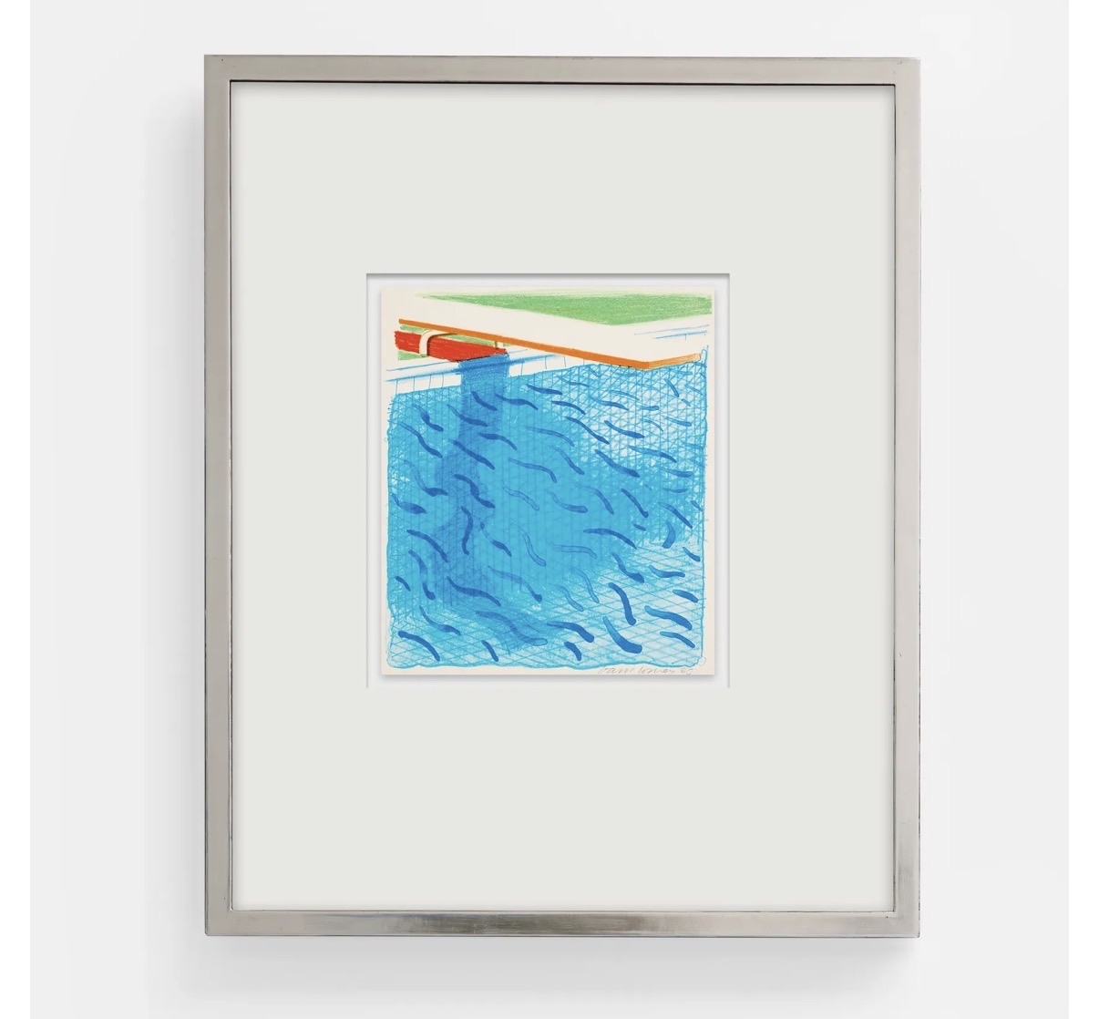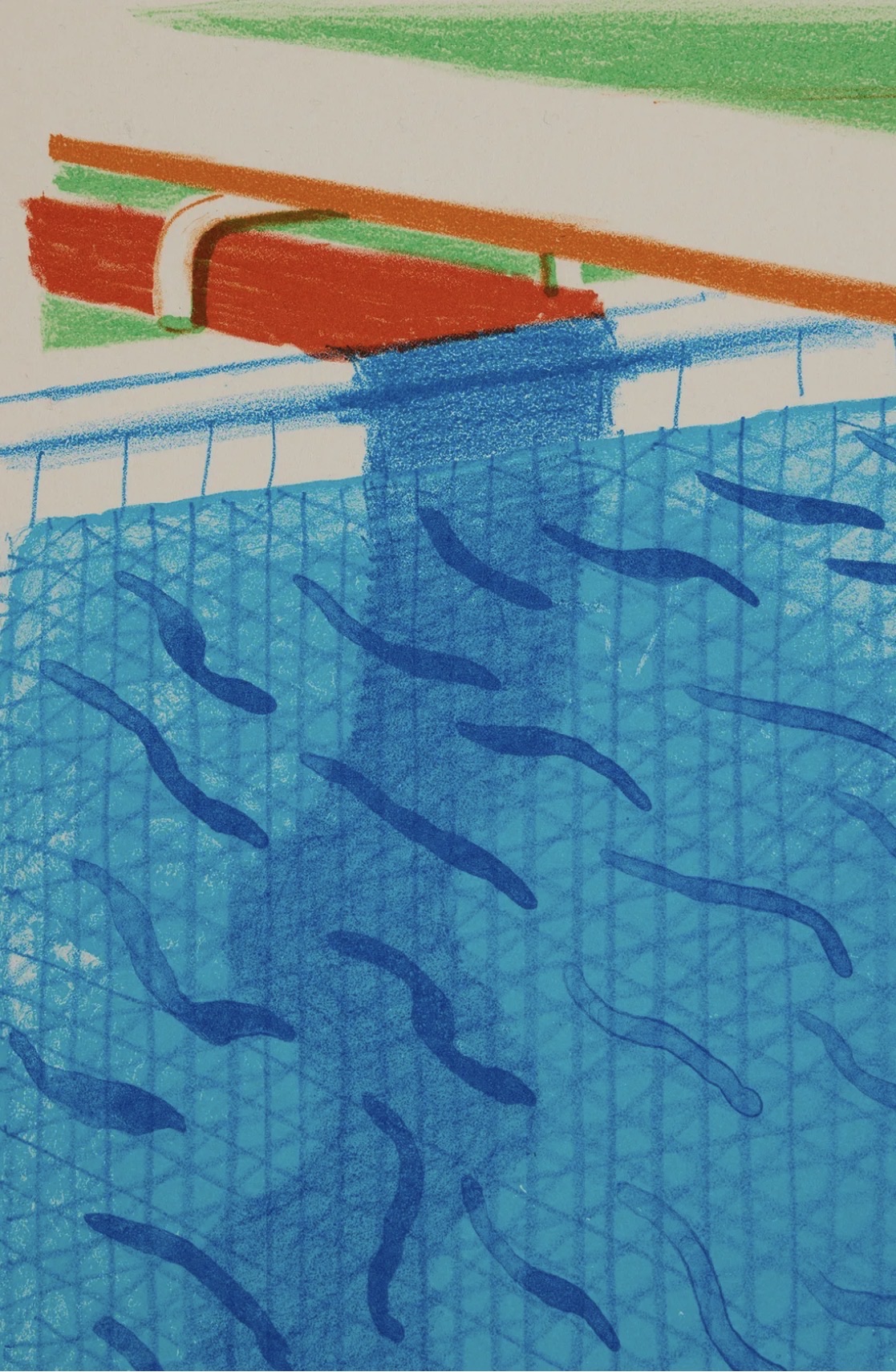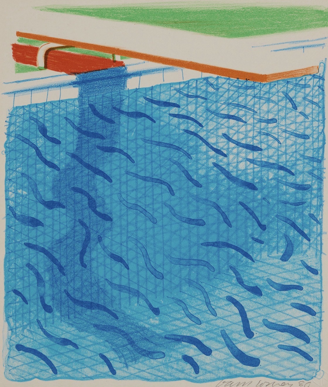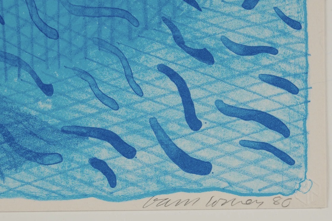 This vibrant colour lithograph by David Hockney depicts a sun-drenched swimming pool viewed from above, rendered with his signature crosshatched blue linework and bold, flat planes of colour. The composition features a red pool float and orange lane divider against a luminous turquoise water surface animated by fluid, wave-like marks. Created in 1980 on Arches cover paper, this print belongs to Hockney's celebrated exploration of Californian pool scenes and is among his most recognisable and collectible graphic works. It is highly sought after by collectors of modern British art and blue chip prints.