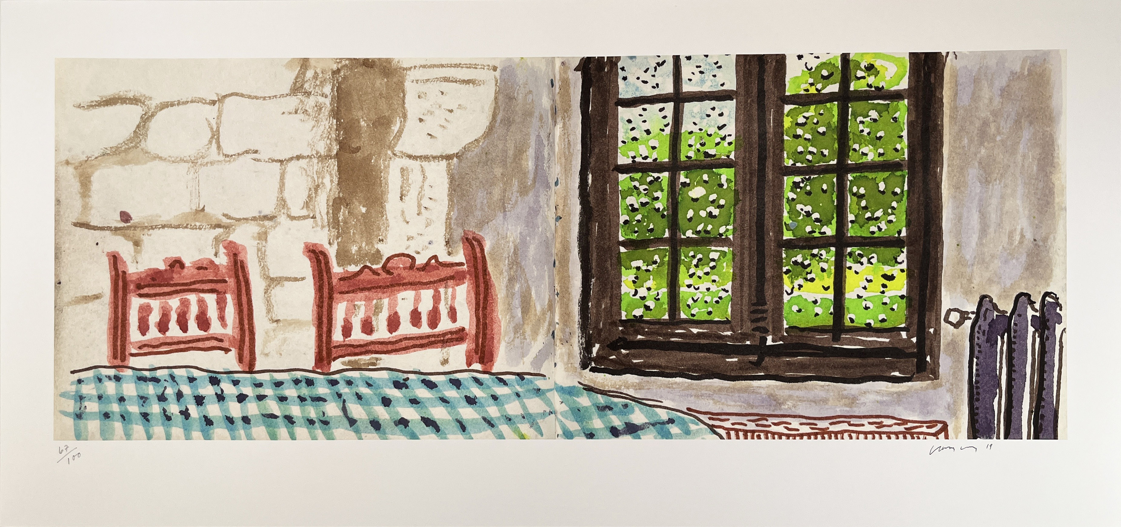 This intimate domestic scene exemplifies Hockney's continued exploration of interior spaces and atmospheric effects, rendered through his distinctive use of vivid color and simplified forms. The work demonstrates the artist's mastery of printmaking techniques, capturing the interplay between architectural elements and natural phenomena with characteristic clarity and compositional balance.