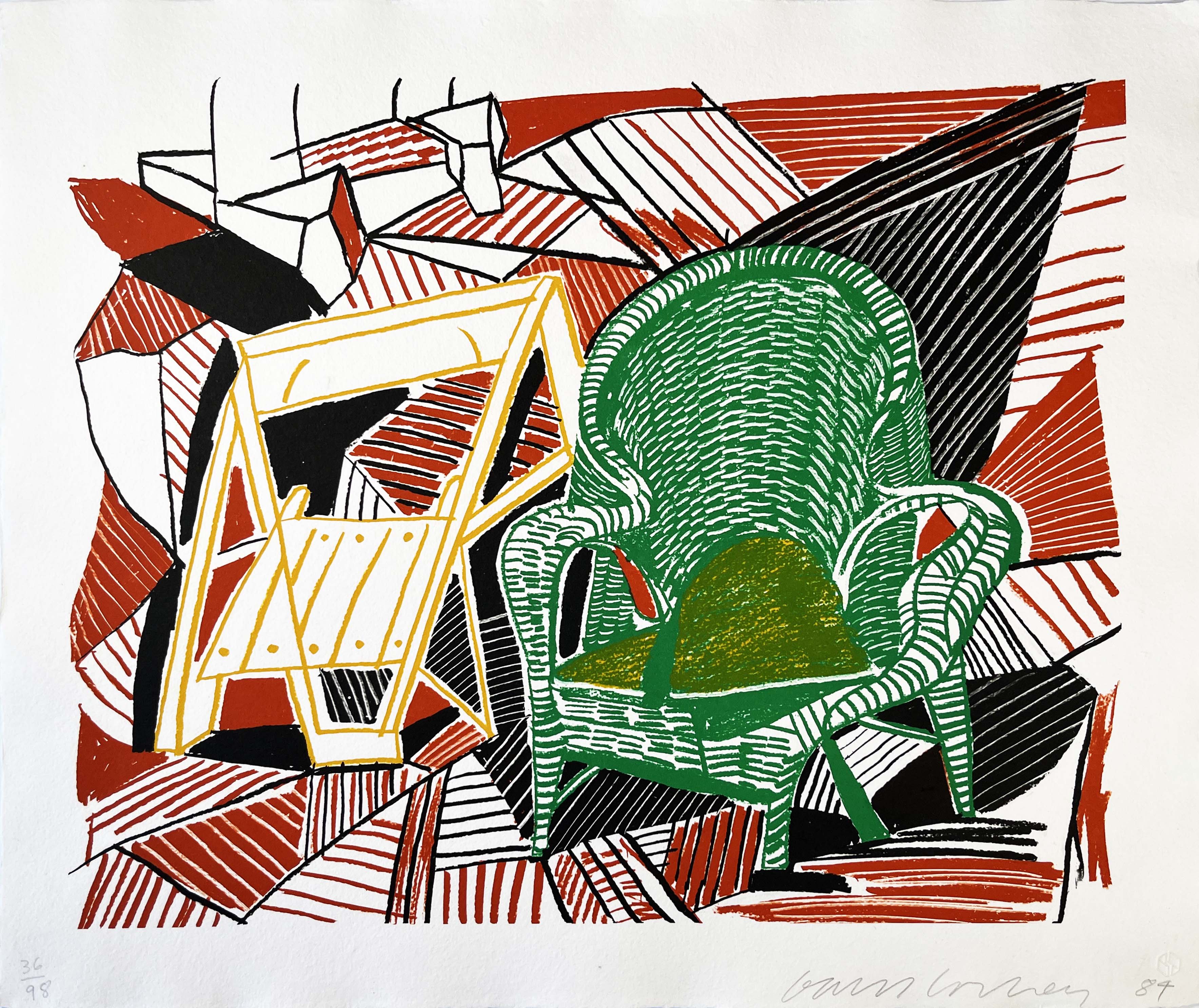 This lithograph exemplifies Hockney's exploration of perspective and spatial relationships through his signature vibrant color palette and geometric compositions. Part of the Moving Focus series, the work demonstrates the artist's continued investigation into how shifting viewpoints can alter our perception of familiar domestic objects.
