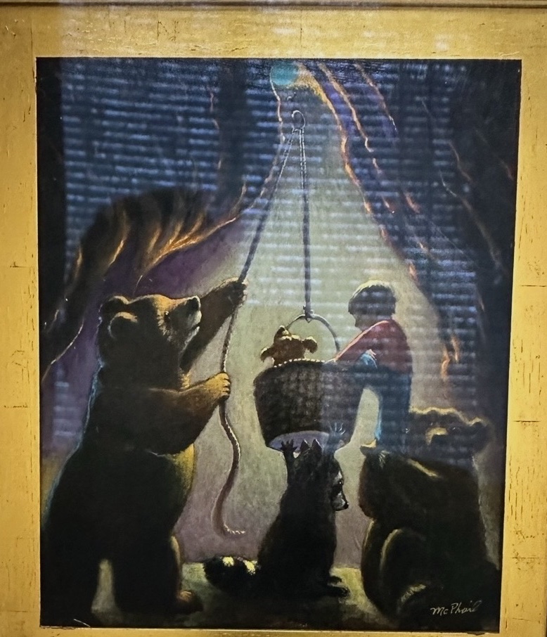 A whimsical and evocative oil painting depicting three bears in what appears to be a winter den or cave opening, with a fourth figure (possibly a person in winter clothing) visible in silhouette. The bears are gathered around a rope or chain suspended from above, creating a mysterious narrative scene. The work features McPhail's characteristic illustrative style with dramatic lighting that illuminates the bears against a darker background, rendered in rich, moody tones.