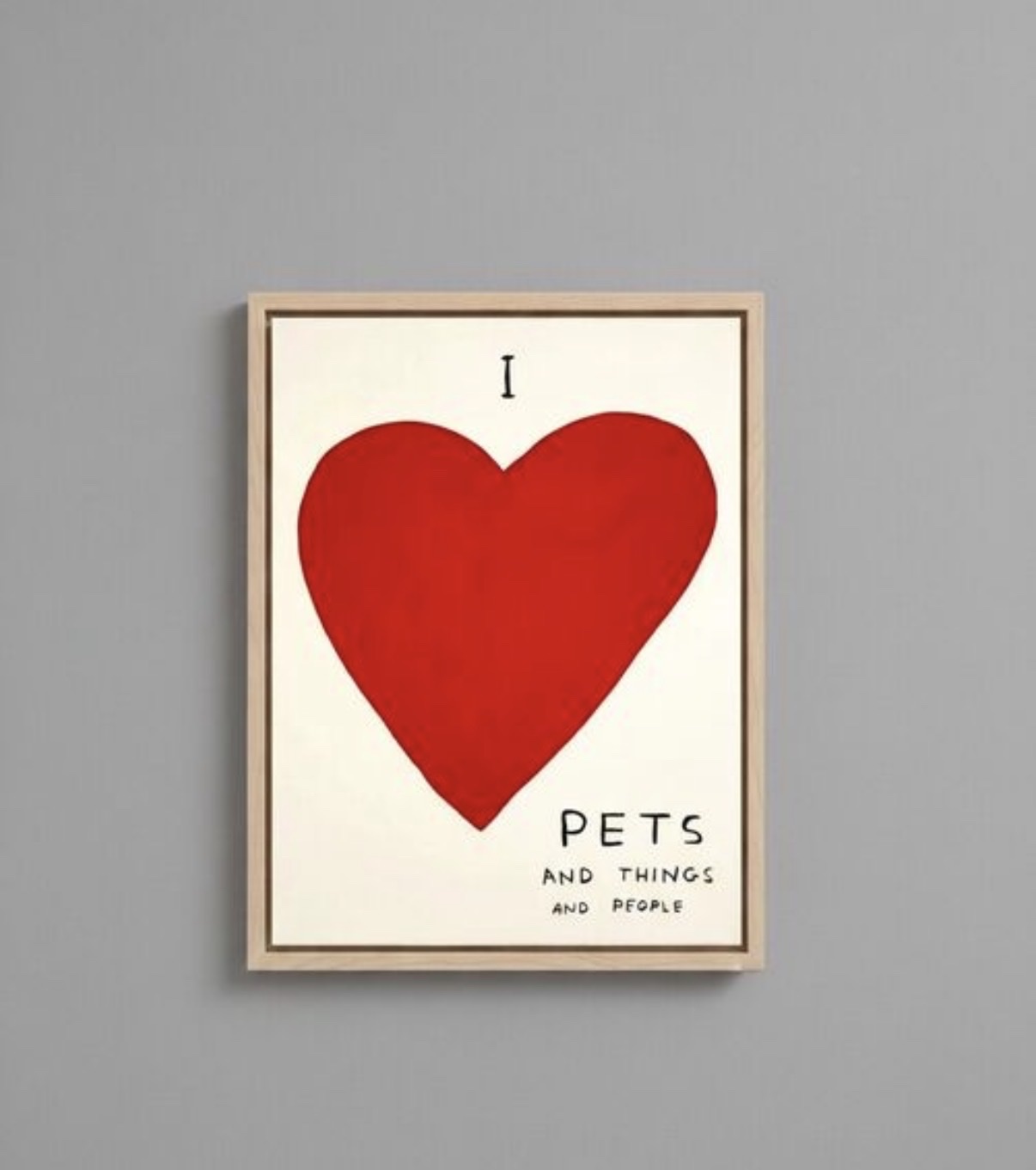 A bold and characteristically witty screenprint by British artist David Shrigley, featuring a large red heart dominating the cream ground, with the hand-lettered text 'I PETS AND THINGS AND PEOPLE' arranged around it in Shrigley's instantly recognisable naive script. The work exemplifies Shrigley's deadpan humour and graphic economy, distilling complex emotional sentiments into disarmingly simple imagery. Printed on heavyweight Somerset Tub Sized Satin White 410gsm paper, this is a limited edition of 125, hand-signed by the artist, and presented in a natural wood float frame.