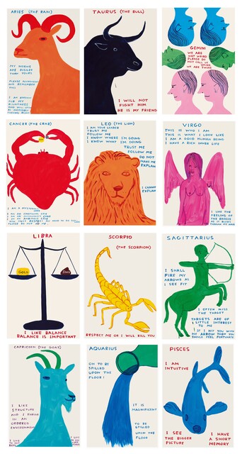 This comprehensive set of twelve zodiac signs was created using offset lithography on premium Munken Lynx paper in 2024. Each print in the series presents astrological symbols interpreted through Shrigley's raw and unrefined artistic approach. The collection combines traditional zodiac imagery with the artist's distinctive crude drawing style. The use of quality paper stock elevates the presentation while maintaining the work's inherent irreverent character. Together, the twelve prints form a complete exploration of astrological themes.
