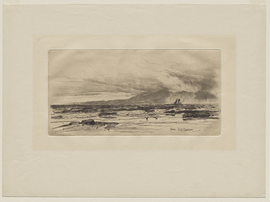 "Arran" is an etching by Scottish artist David Young Cameron that depicts the Isle of Arran, likely capturing its distinctive mountainous landscape off the coast of Ayrshire. Cameron was a master printmaker known for his atmospheric landscapes rendered through precise etching technique, and this work exemplifies his skill in conveying mood and topographical detail through the medium. The composition reflects Cameron's characteristic approach to Scottish scenery, combining careful observation with a romantic sensibility typical of early twentieth century landscape printmaking.