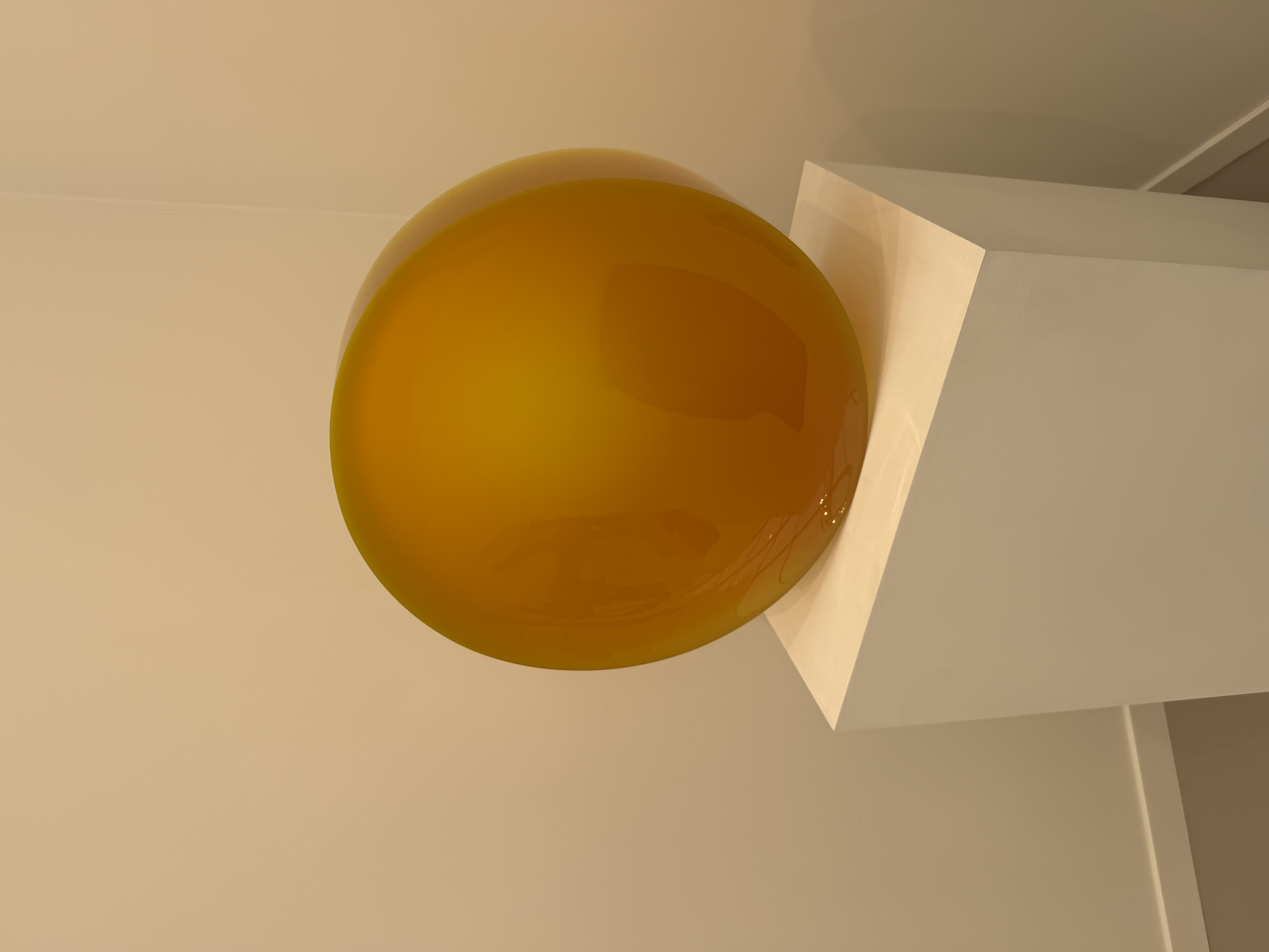 A stunning sculptural work by De Wain Valentine, a pioneering Light and Space artist. This fluorescent yellow cast polyester resin sculpture features a concave circular form that captures and refracts light through its translucent surface. Created in 1968 and produced posthumously in 2021, this work exemplifies Valentine's mastery of industrial materials and his exploration of light, color, and form that defined the California Light and Space movement.
