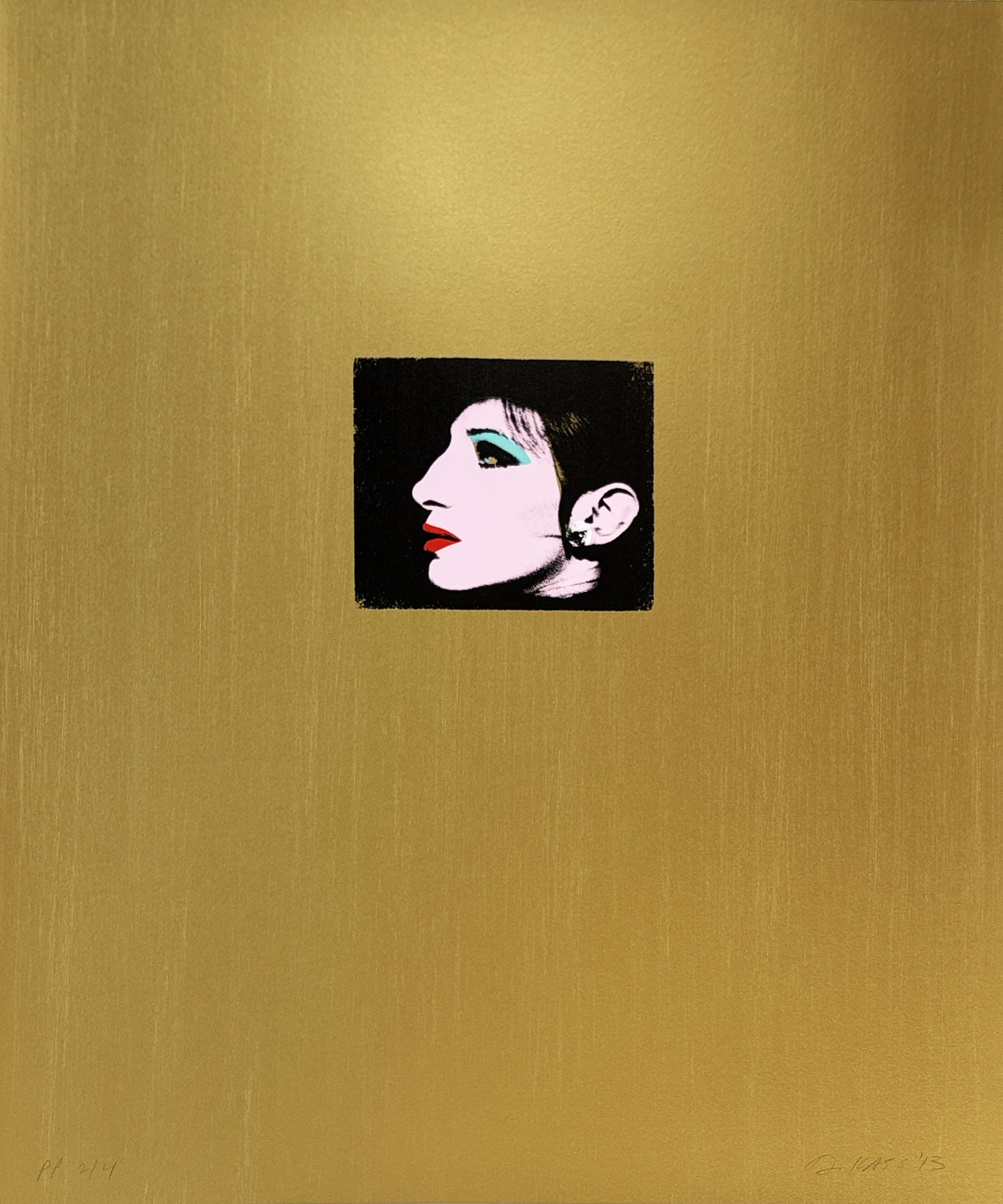 In this silkscreen work, Kass continues her exploration of pop art's relationship to identity and celebrity, transforming Barbra Streisand into an icon through Warhol-inspired repetition and vibrant color treatment. The nine-color printing process creates rich tonal variations that elevate the portrait beyond simple appropriation into a meditation on Jewish-American stardom.