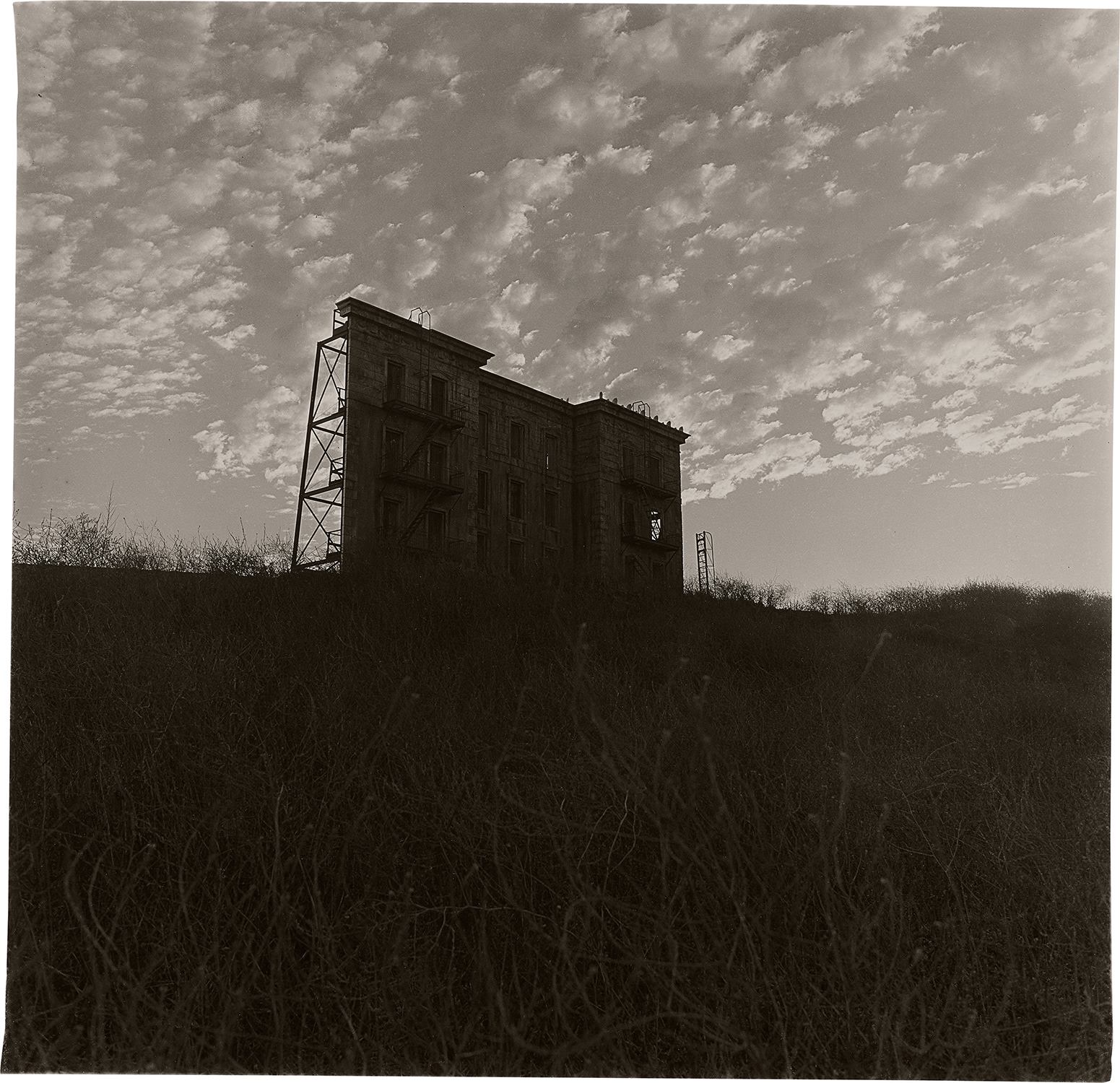Diane Arbus's photograph of a house perched on a Hollywood hill was printed later by master printer Neil Selkirk from the original gelatin silver negative. The work captures architectural and landscape elements.