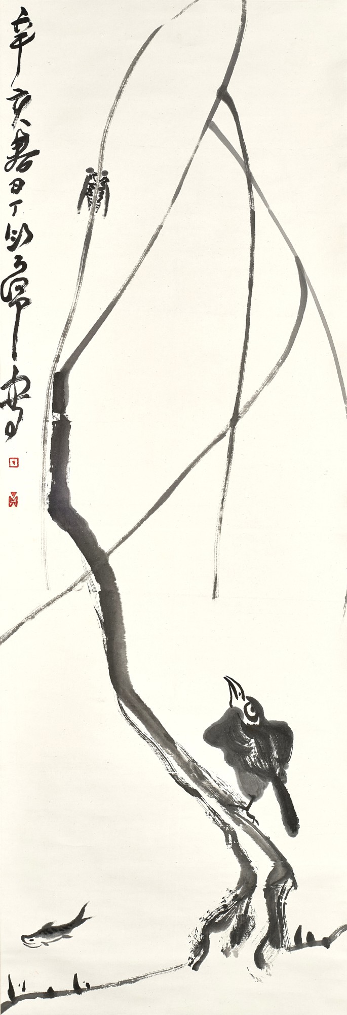 A minimalist ink composition depicting three natural subjects—a cicada, bird, and fish—arranged as a hanging scroll. The work demonstrates the artist's skill in capturing essential forms with economical brushwork.