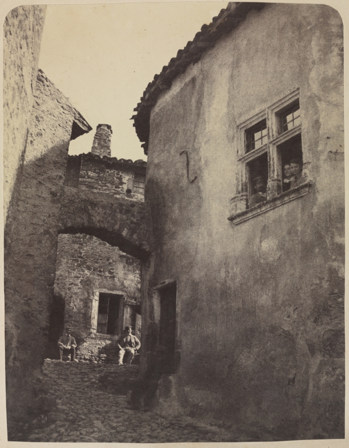 Among the earliest examples of albumen printing from wax paper negatives, this village scene demonstrates the softer, more painterly qualities achievable through this pioneering photographic technique.