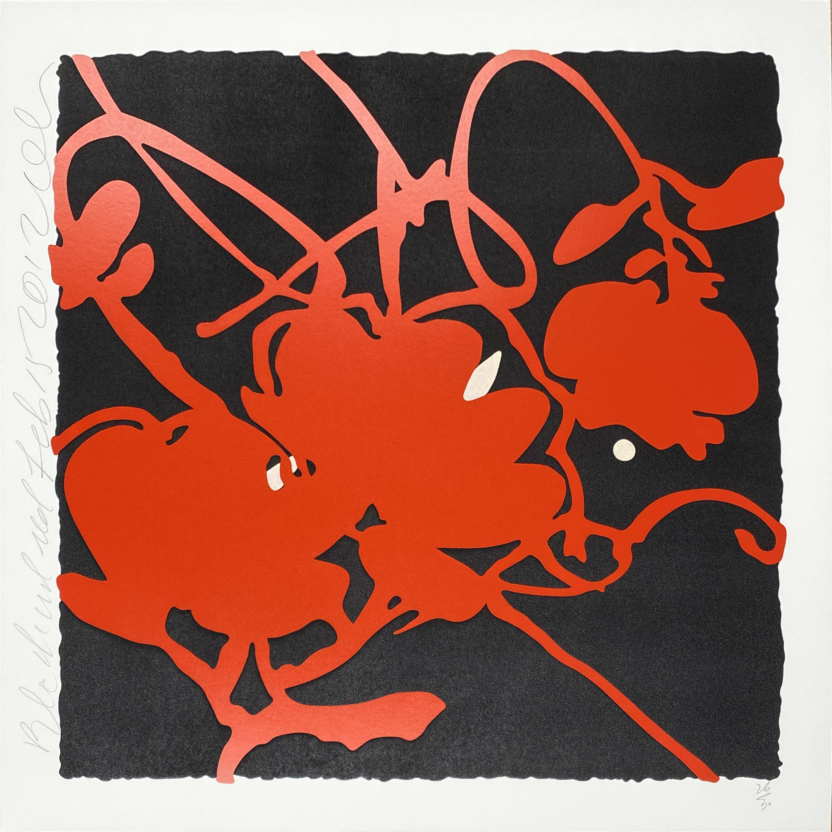 This screenprint exemplifies Sultan's signature industrial aesthetic, combining his iconic floral motif with unconventional materials including flocking and tar-like texture that blur the boundaries between printmaking and sculptural practice. The bold red blooms against stark black ground demonstrate his mastery of reductive composition while the tactile surface treatment adds dimensional depth characteristic of his material investigations.