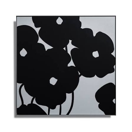A striking example from Donald Sultan's iconic floral series, this painting features bold, black silhouetted poppies against a pale grey background. Sultan's signature use of high-contrast, flat forms and simplified botanical shapes creates a powerful graphic presence that bridges abstraction and representation. The work exemplifies his mastery of large-scale decorative compositions that carry both visual weight and formal elegance.