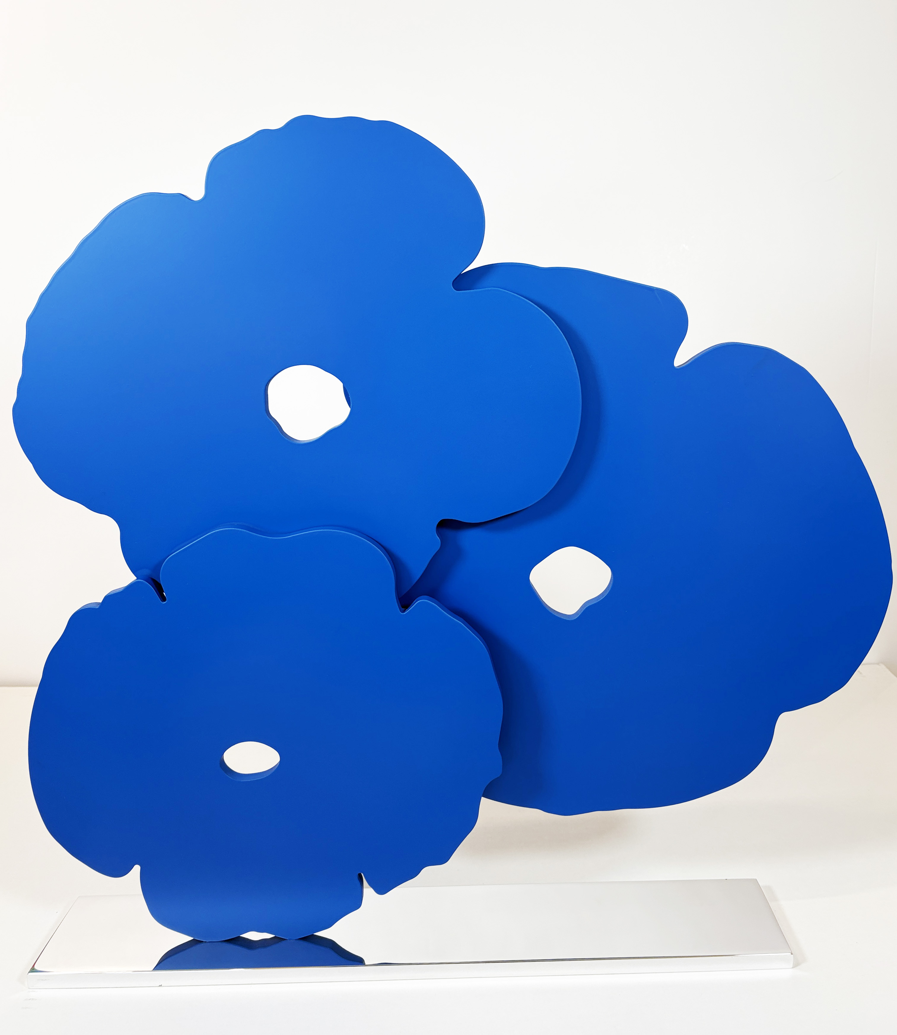 Sultan's *Blue Poppies* exemplifies his signature approach to industrial materials, transforming painted aluminum into delicate botanical forms that contrast the medium's inherent hardness with organic beauty. This sculptural work extends his decades-long exploration of floral imagery beyond his renowned tar and tile paintings into three-dimensional space.