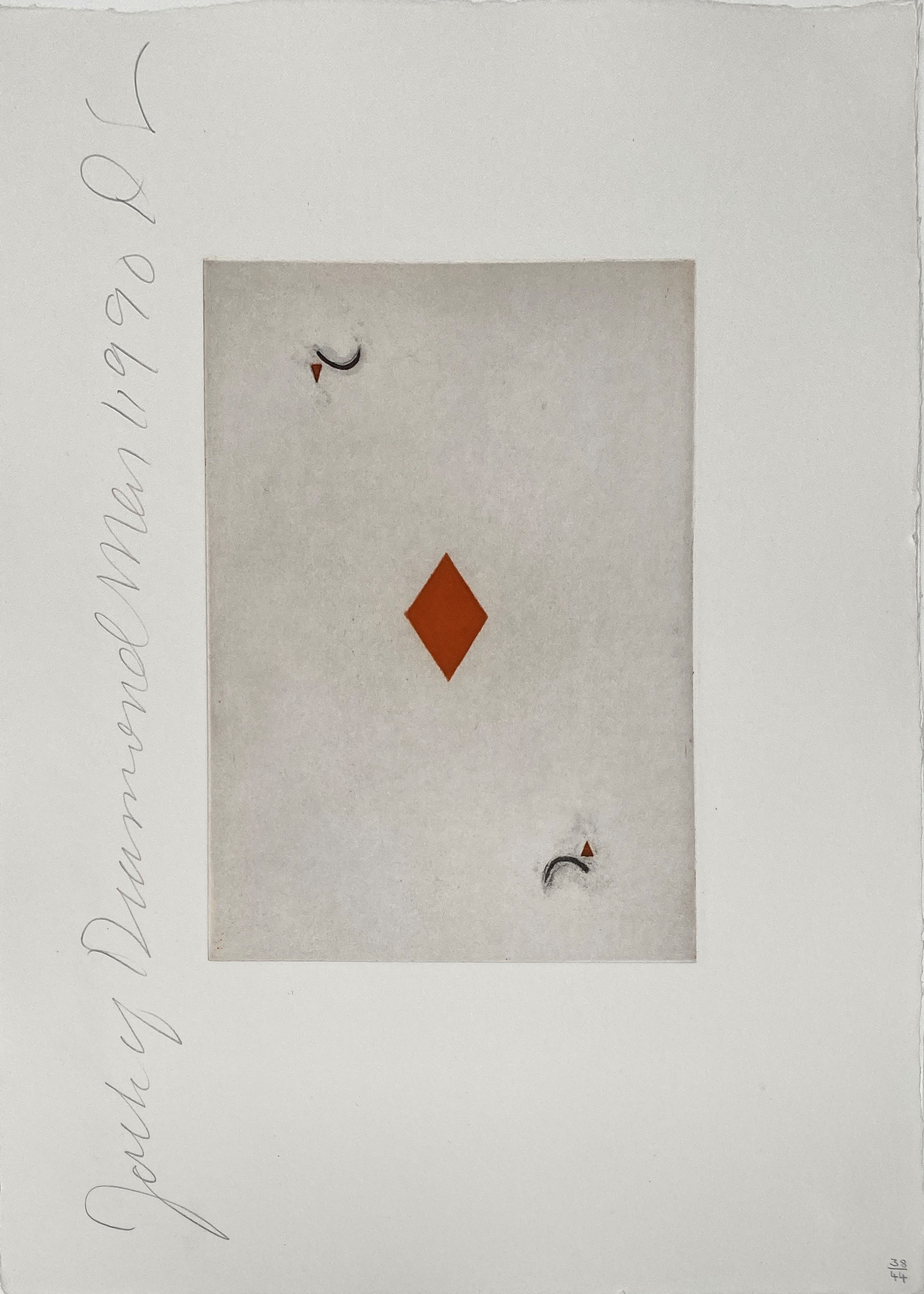 This aquatint exemplifies Sultan's exploration of familiar iconography through his characteristic reductive aesthetic, transforming the traditional playing card motif into a bold, graphic composition. The artist's mastery of the aquatint technique creates rich tonal variations that emphasize the geometric forms and symbolic power of the Jack of Diamonds.