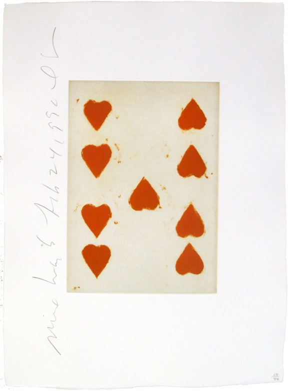 Sultan's "Playing Cards (Nine of Hearts)" exemplifies his distinctive approach to printmaking, transforming an everyday object into a monumental image through the rich tonal qualities of aquatint on handmade Twinrocker paper. Part of his broader exploration of common iconography, this work demonstrates his ability to elevate mundane subjects through sophisticated printmaking techniques and bold compositional choices.