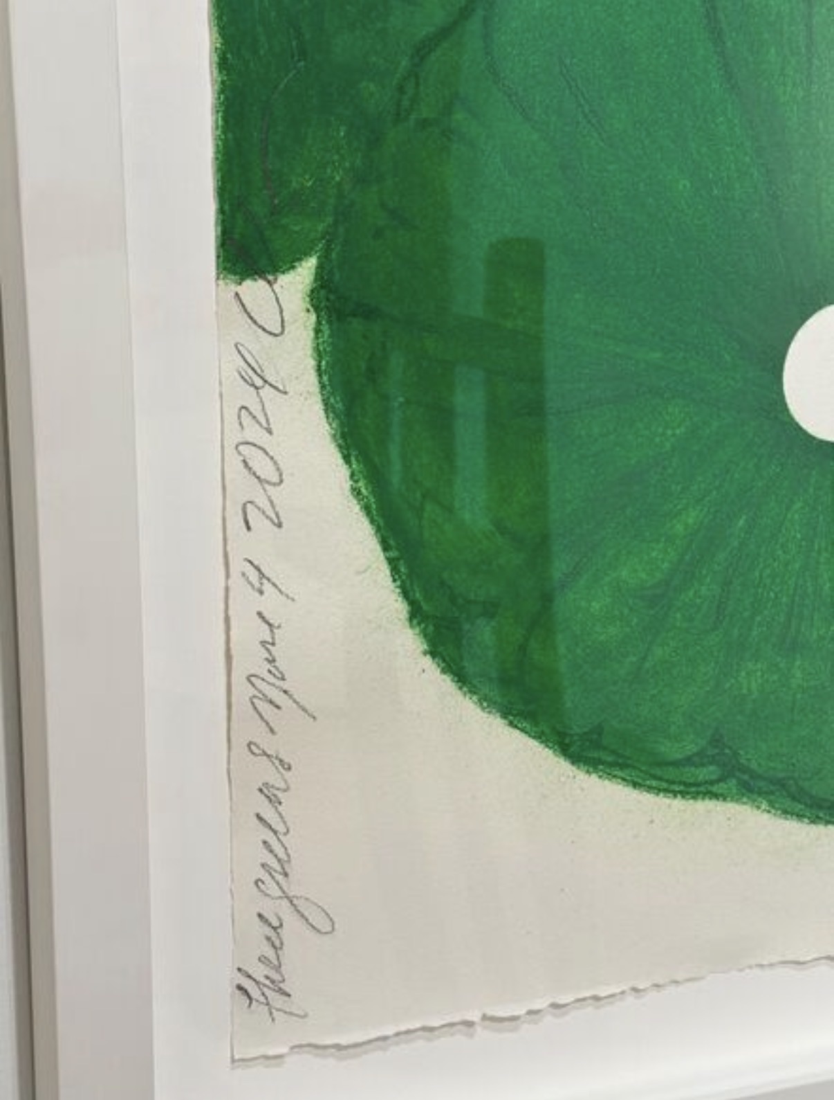 Framed size: 29 × 36 3/8 in (73.7 × 92.4 cm). Unframed size: 22 1/2 × 30 in (57.2 × 76.2 cm). Unique work — not an edition. Certificate of Authenticity included, issued by gallery. Ships from Napa, CA, US. Pickup available. Domestic and international shipping calculated at checkout. Taxes may apply at checkout. Listed via Artsy with Make an Offer and Purchase options. Series: Poppies. Artwork inscribed on front lower left: 'Three Green June 4 2024' with artist signature.