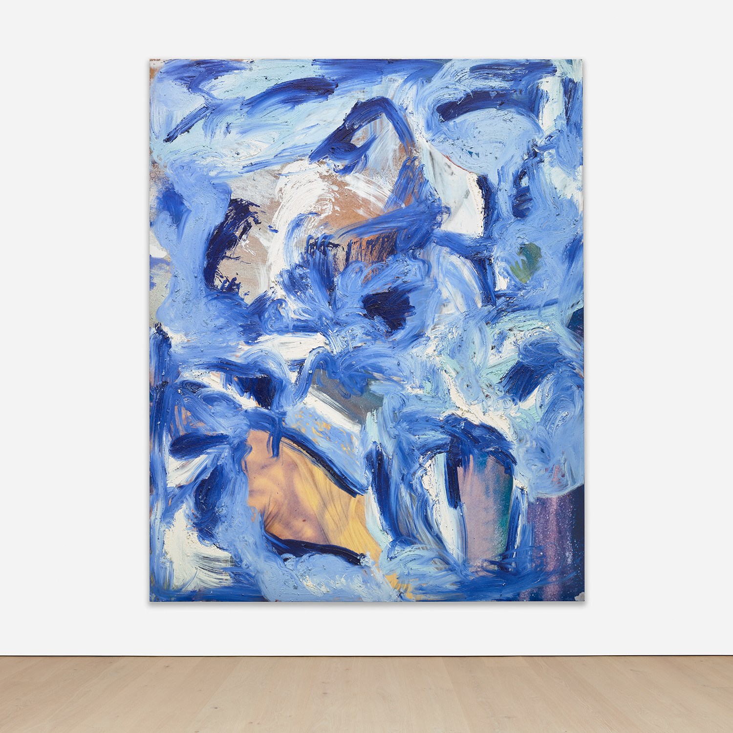 Donna Huanca's 2018 work combining oil, sand, and digital print on canvas, titled Skadi. The incorporation of sand alongside traditional painting materials creates a textured, hybrid surface.
