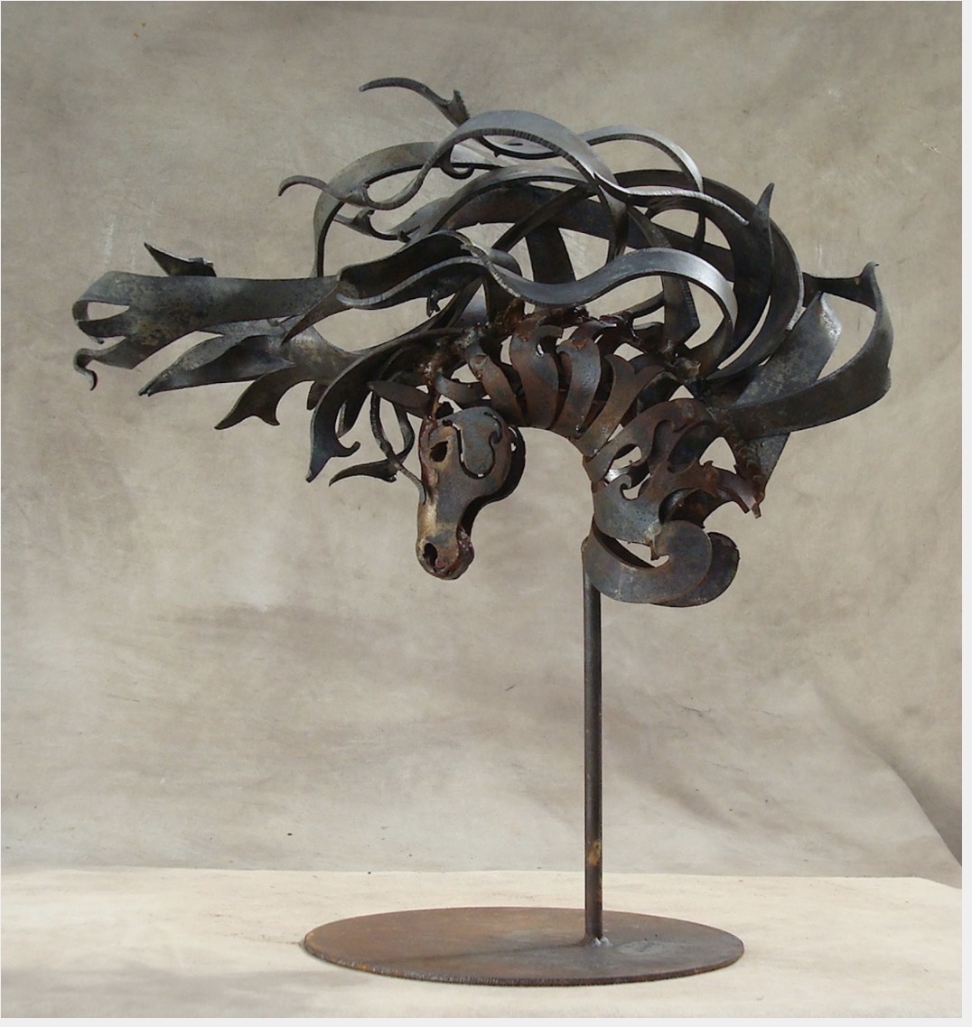 A dynamic metal sculpture by Doug Hays depicting a horse's head with flowing, flame-like mane rendered in cut and welded steel. The work demonstrates masterful metalworking technique with sweeping curved elements that create a sense of movement and energy. Mounted on a standing base, the sculpture combines figurative and abstract elements in a dramatic composition.