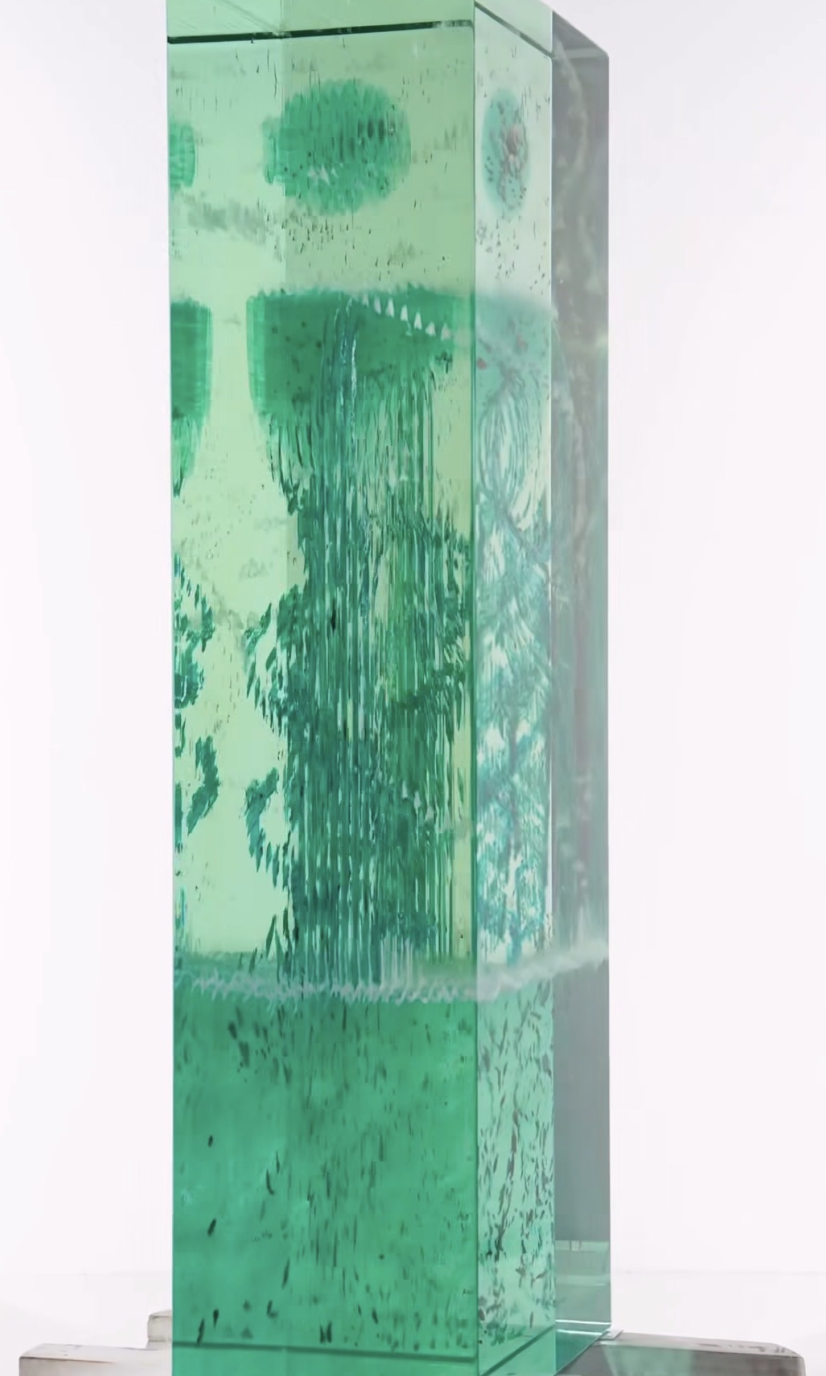 Cephaloproteus Riverhead III is a large-scale sculptural work by Dustin Yellin, measuring over six feet tall. The piece features layered glass panels filled with intricate collaged imagery suspended in epoxy resin, creating a three-dimensional narrative landscape in signature turquoise tones. The work showcases Yellin's distinctive technique of building complex visual worlds within transparent architectural forms, with swirling organic forms and scattered elements creating depth and movement throughout the composition.