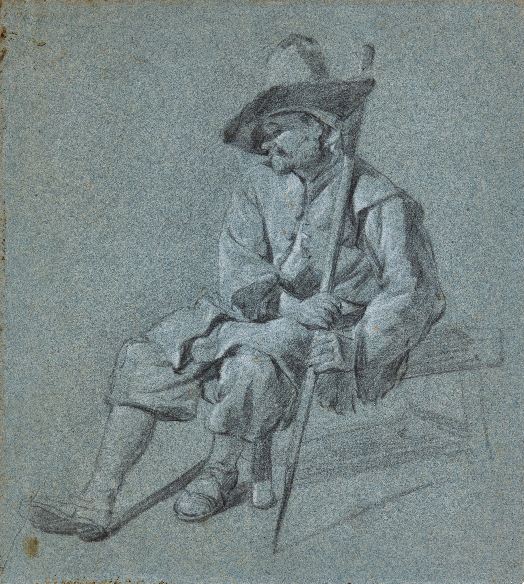 Study of a seated man in a hat, holding a staff