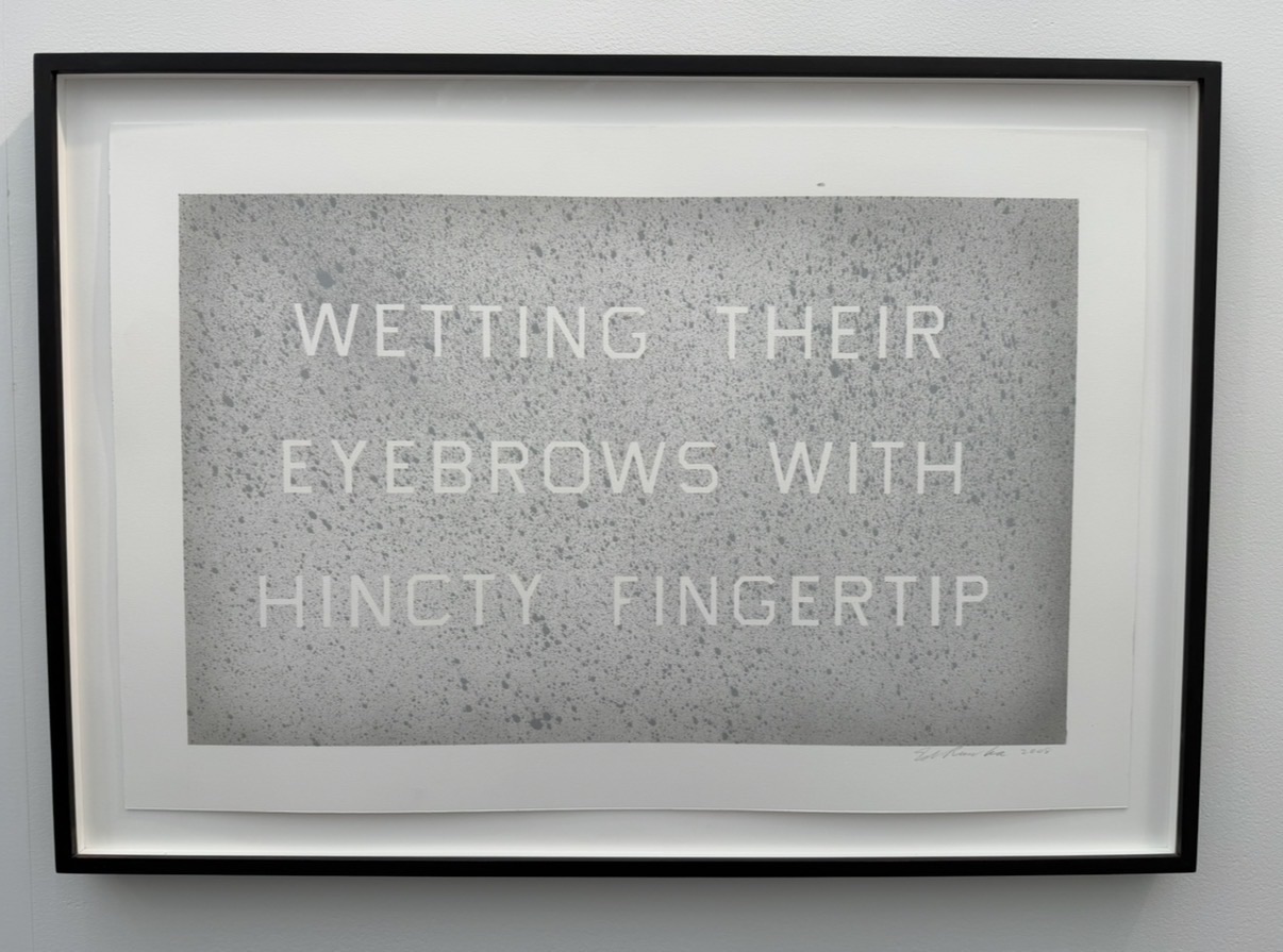 A characteristic text-based work by Edward Ruscha from 2008, featuring the phrase "WETTING THEIR EYEBROWS WITH HINCTY FINGERTIP" in white stenciled letters against a gray textured background. The work exemplifies Ruscha's decades-long exploration of language, typography, and deadpan humor, executed in acrylic on museum board. This piece demonstrates the artist's signature approach to isolating enigmatic phrases that challenge linguistic meaning while creating powerful visual impact.