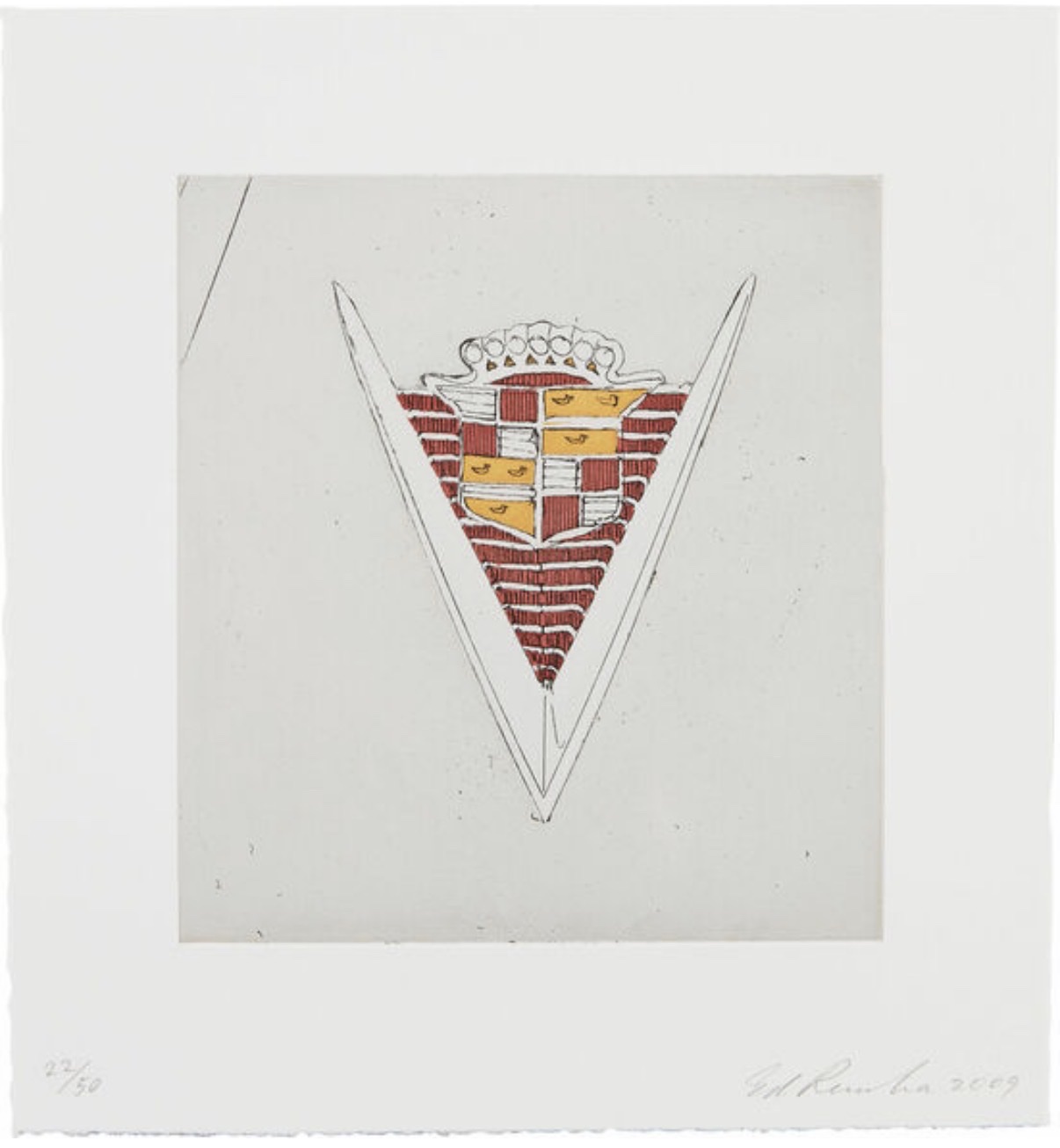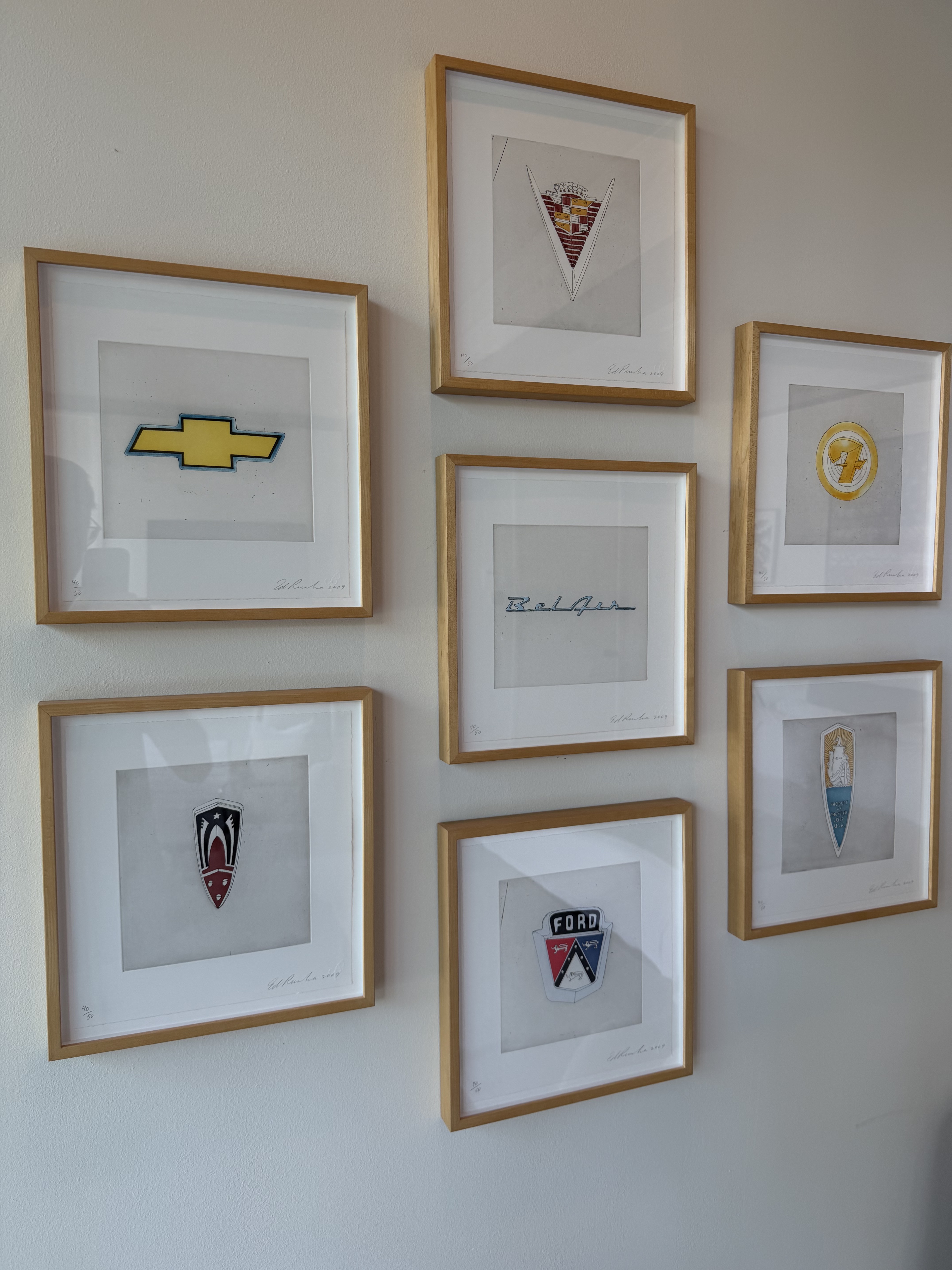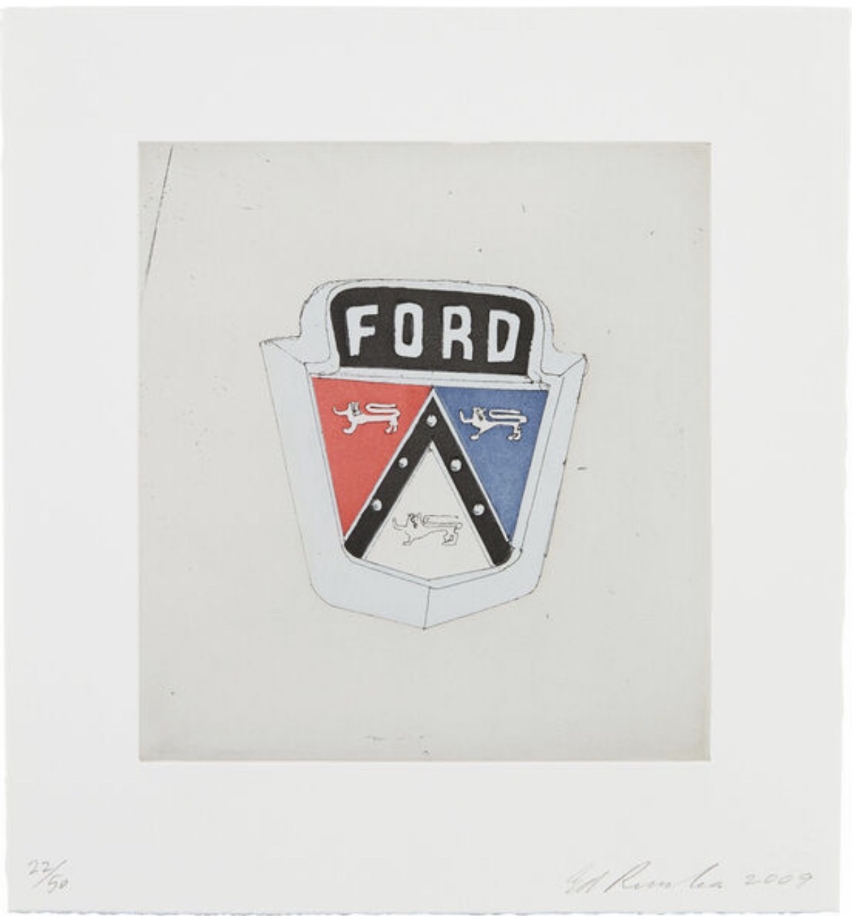 Portfolio of seven color aquatints with hard ground etching depicting iconic American automotive brand emblems. Part of a limited edition set of 50, published by Crown Point Press. Hand-signed by the artist in the lower right corner and includes a gallery-issued certificate of authenticity.
