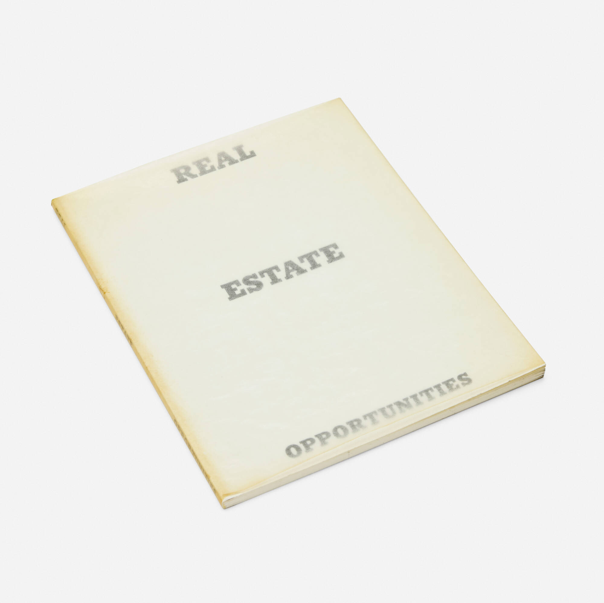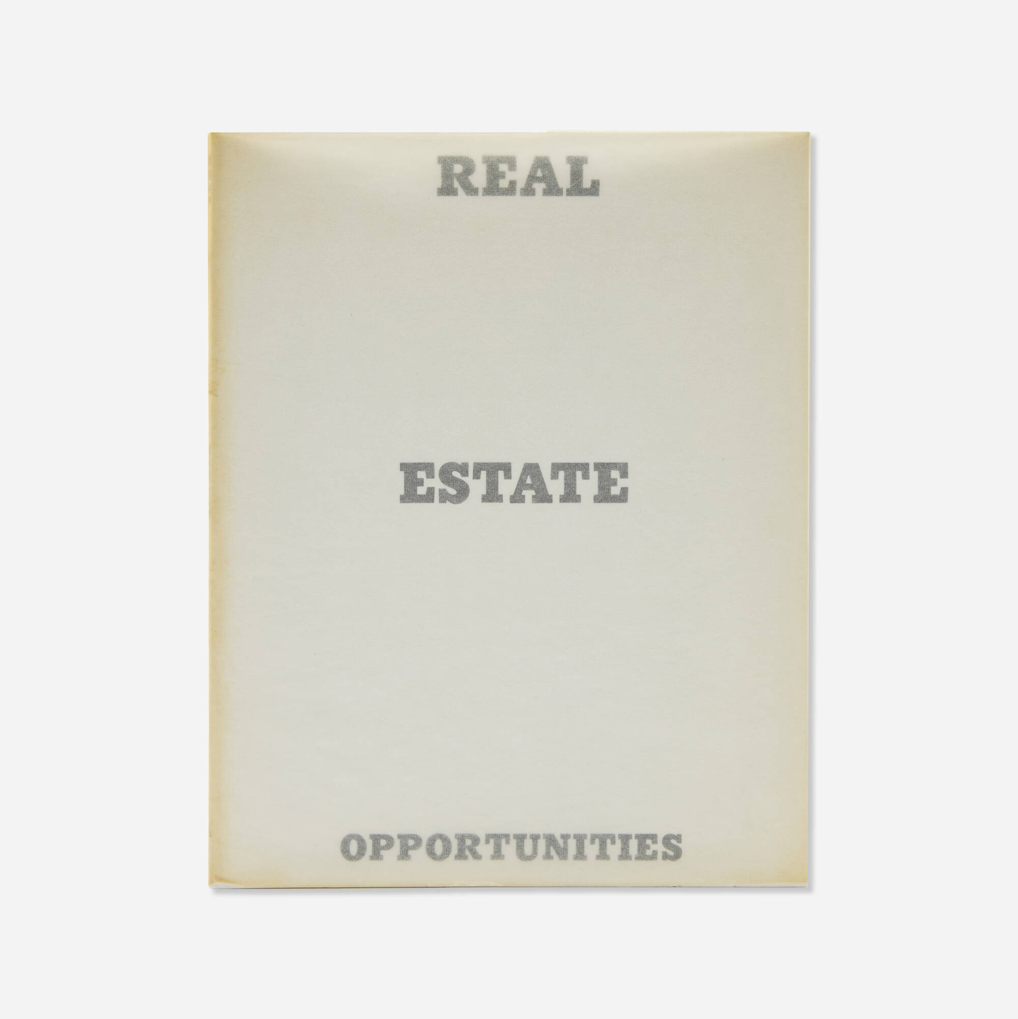 Ed Ruscha's 1970 work presents the phrase 'Real Estate Opportunities' through black and white offset printing on heavy weight paper. The stark typography and minimalist presentation transform commercial language into an artistic subject. Ruscha's work examines the relationship between words, meaning, and value in American consumer culture. The use of offset printing emphasizes the mechanical reproduction and accessibility of the printed image. This piece exemplifies Ruscha's interest in language, real estate speculation, and the commodification of space.