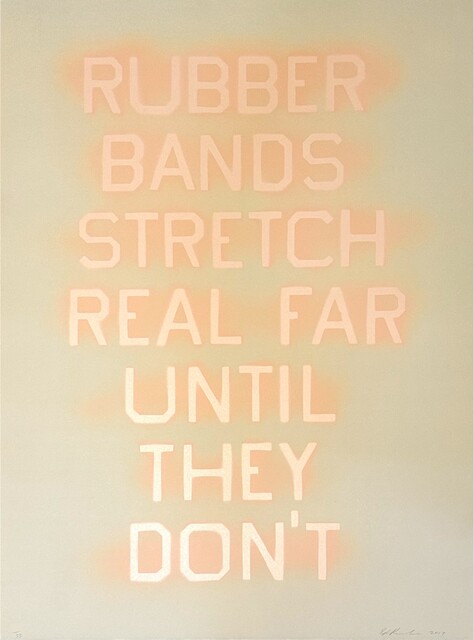 This lithograph presents a minimalist study of the everyday object through the lens of conceptual art. The work focuses on the simple subject of rubber bands rendered through the traditional lithographic process. Created in 2017, this State I version represents the first iteration of the composition. The work exemplifies the artist's interest in finding artistic merit in mundane commercial items.