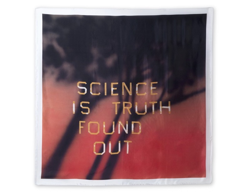 This 2022 silk twill print exemplifies Ruscha's decades-long exploration of text as visual art, presenting the declarative phrase "Science Is Truth Found Out" in his signature typographic style. The work continues the artist's investigation into the relationship between language and meaning while utilizing an unconventional luxury fabric medium.