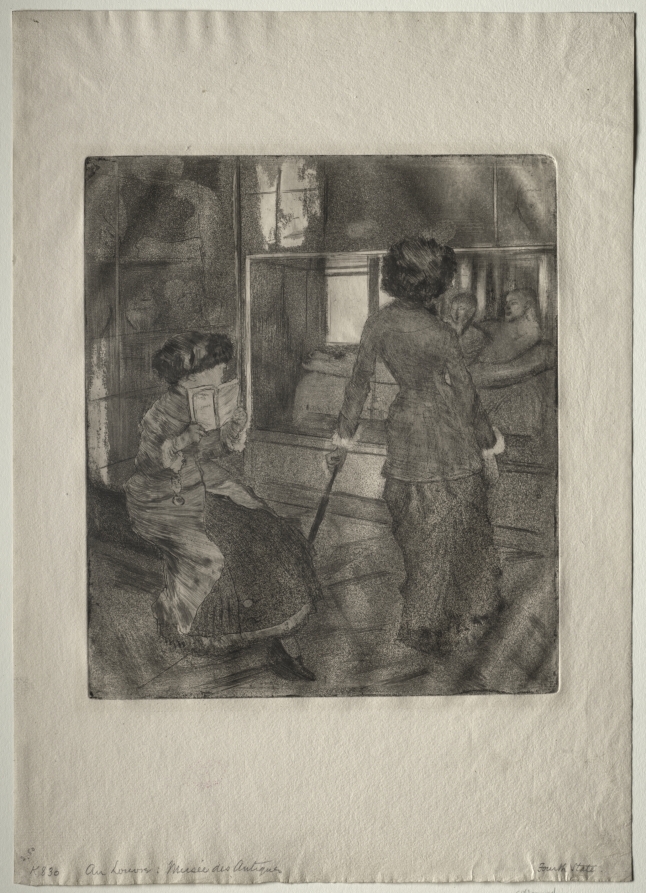 Combining multiple printmaking techniques, this sophisticated work depicts the artist's friend and fellow Impressionist exploring art in one of the world's great museums.
