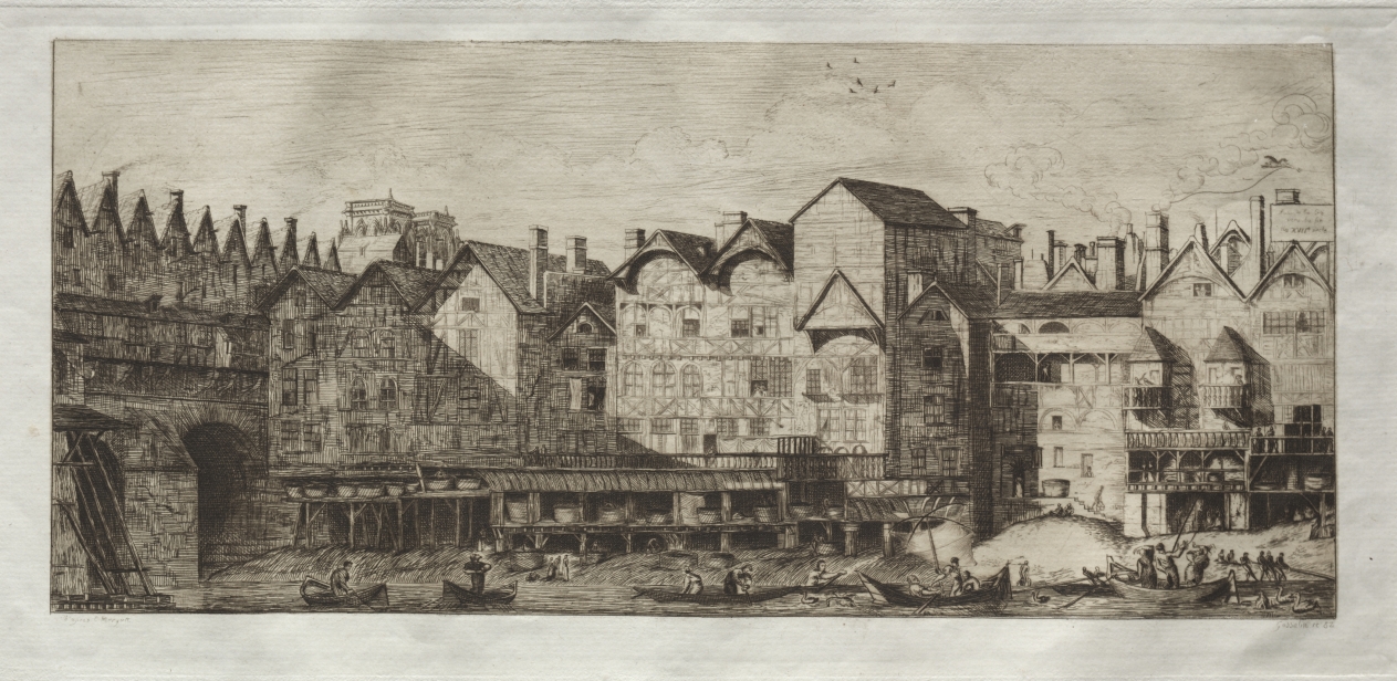 Serving as both historical document and artistic interpretation, this etching reconstructs the appearance of medieval Paris based on careful archaeological and architectural research.