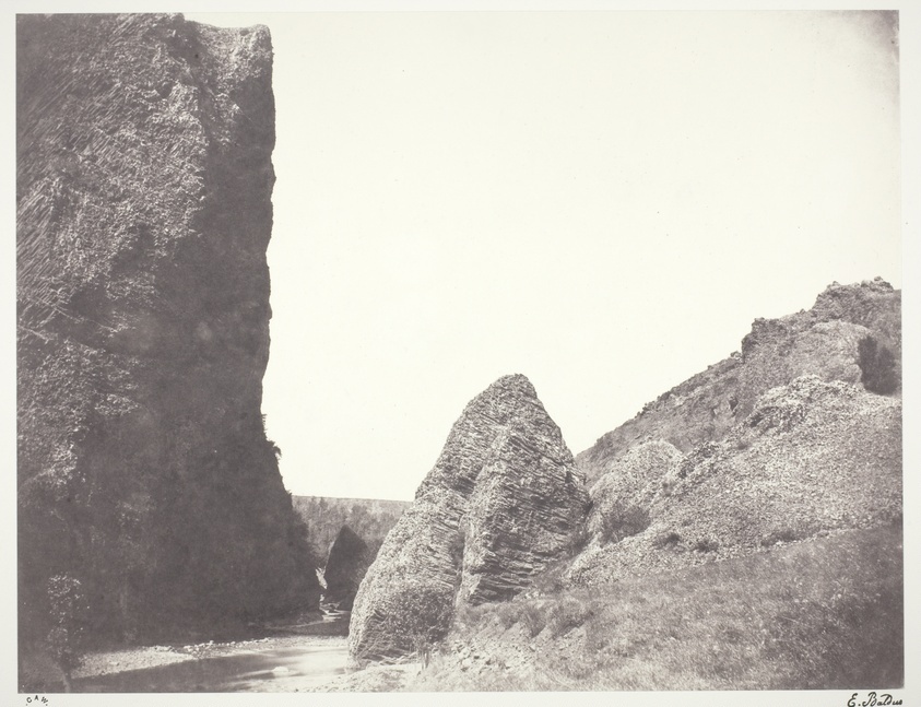 Natural rock formations and flowing water showcase the salted paper process's ability to render subtle tonal variations in landscape subjects with painterly sensitivity.