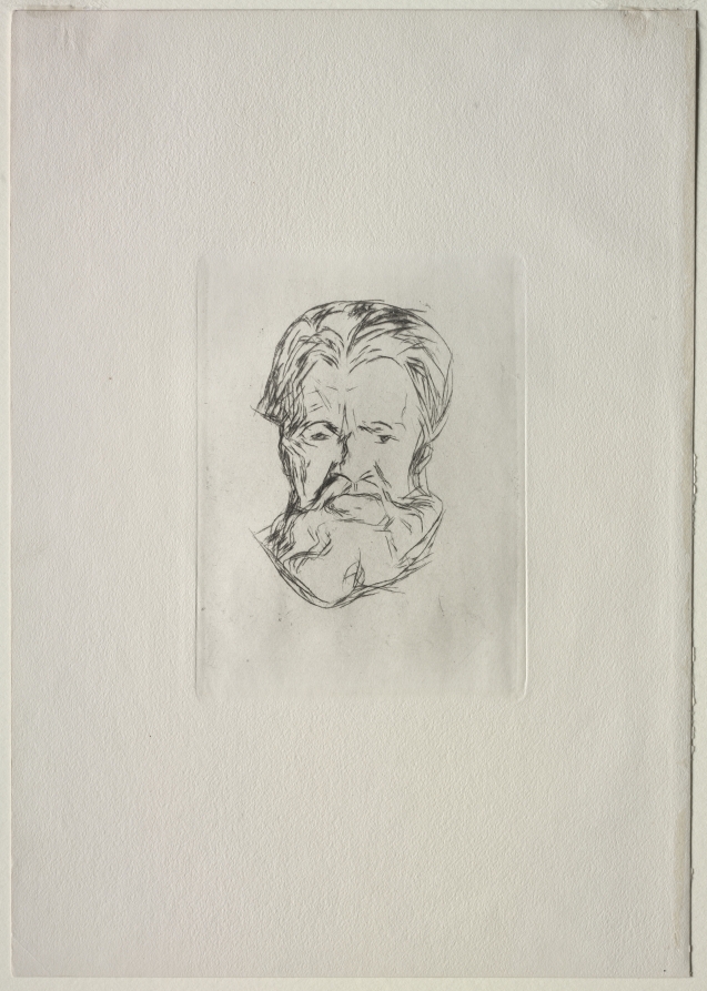 Demonstrating Munch's mastery of drypoint's expressive potential, this psychologically charged portrait strips away all but the most essential features to reveal the subject's inner emotional state.