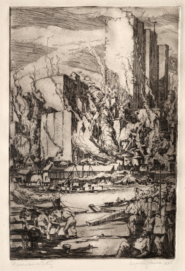 River, Monochrome, American, Etching, Landscape, Urban, Modern