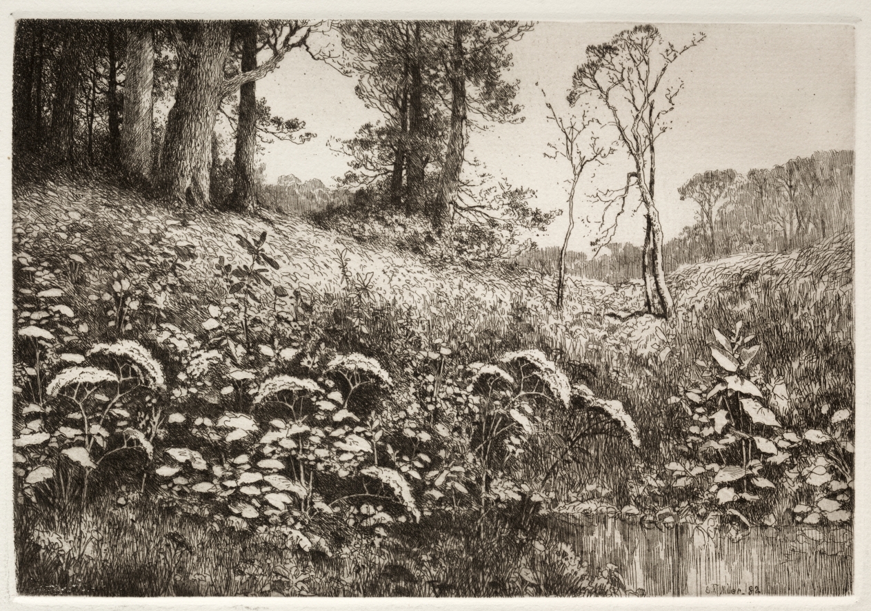 Bucolic tranquility pervades Miller's delicate etching, which captures the languid atmosphere of a summer day with the soft, atmospheric effects achievable through careful plate work and printing.