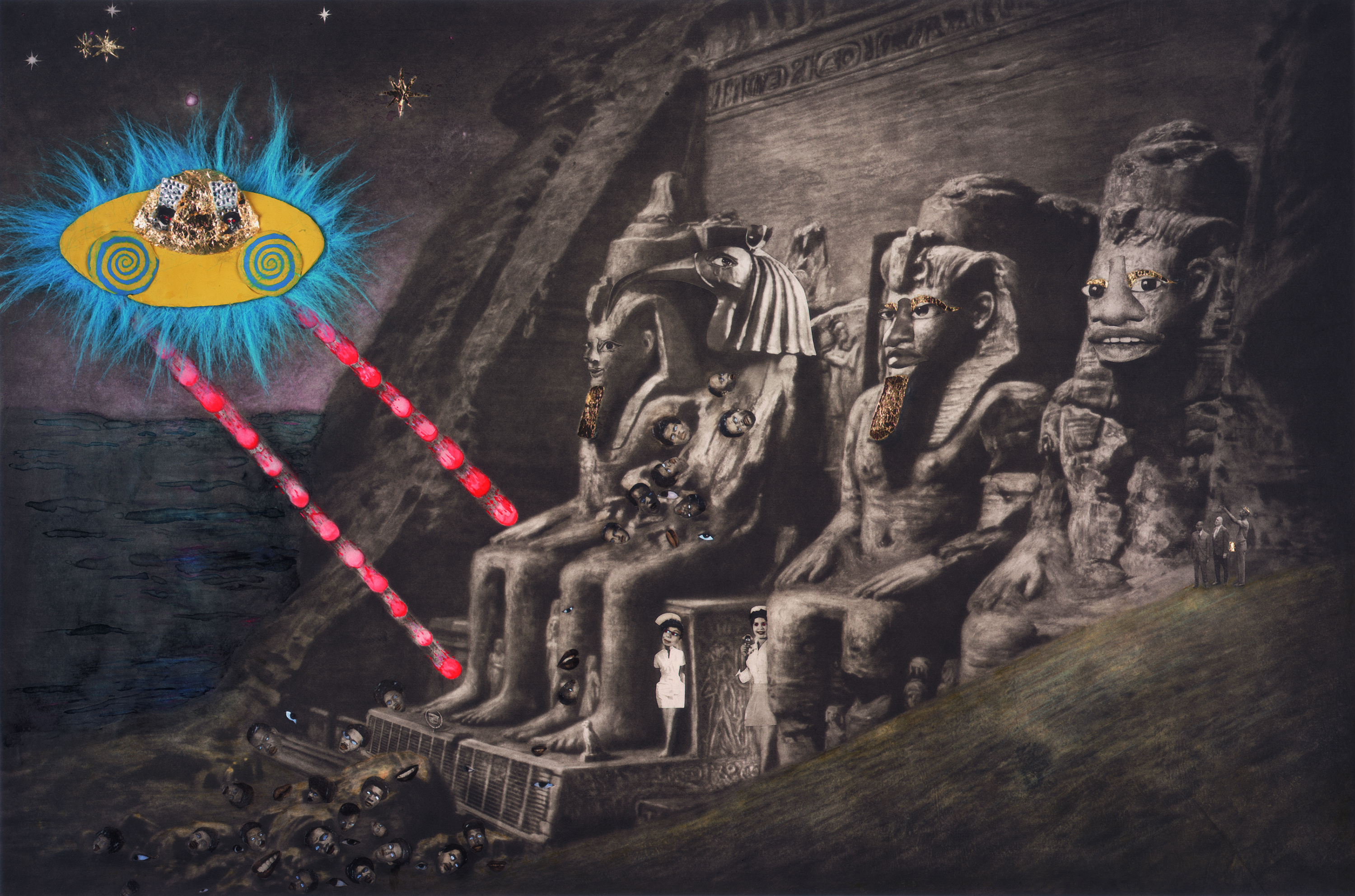 Ellen Gallagher's 2005 work 'Abu Simbel' employs an extensive mixed-media technique combining photogravure, watercolor, pencil, varnish, pomade, plasticine, fur, gold leaf, and crystals. The layered composition creates a complex visual surface referencing the ancient Egyptian monument.