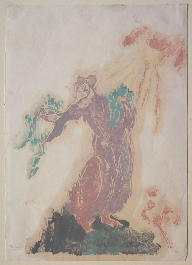 "Flower Girl" is a color woodcut by Finnish artist Ellen Thesleff, created during a period when she was exploring modernist printmaking techniques. The work exemplifies her interest in capturing light, form, and intimate domestic scenes through the bold, expressive qualities inherent to the woodcut medium. Thesleff's use of layered color blocks and simplified forms reflects the influence of Japanese prints and Northern European modernism on her artistic practice.