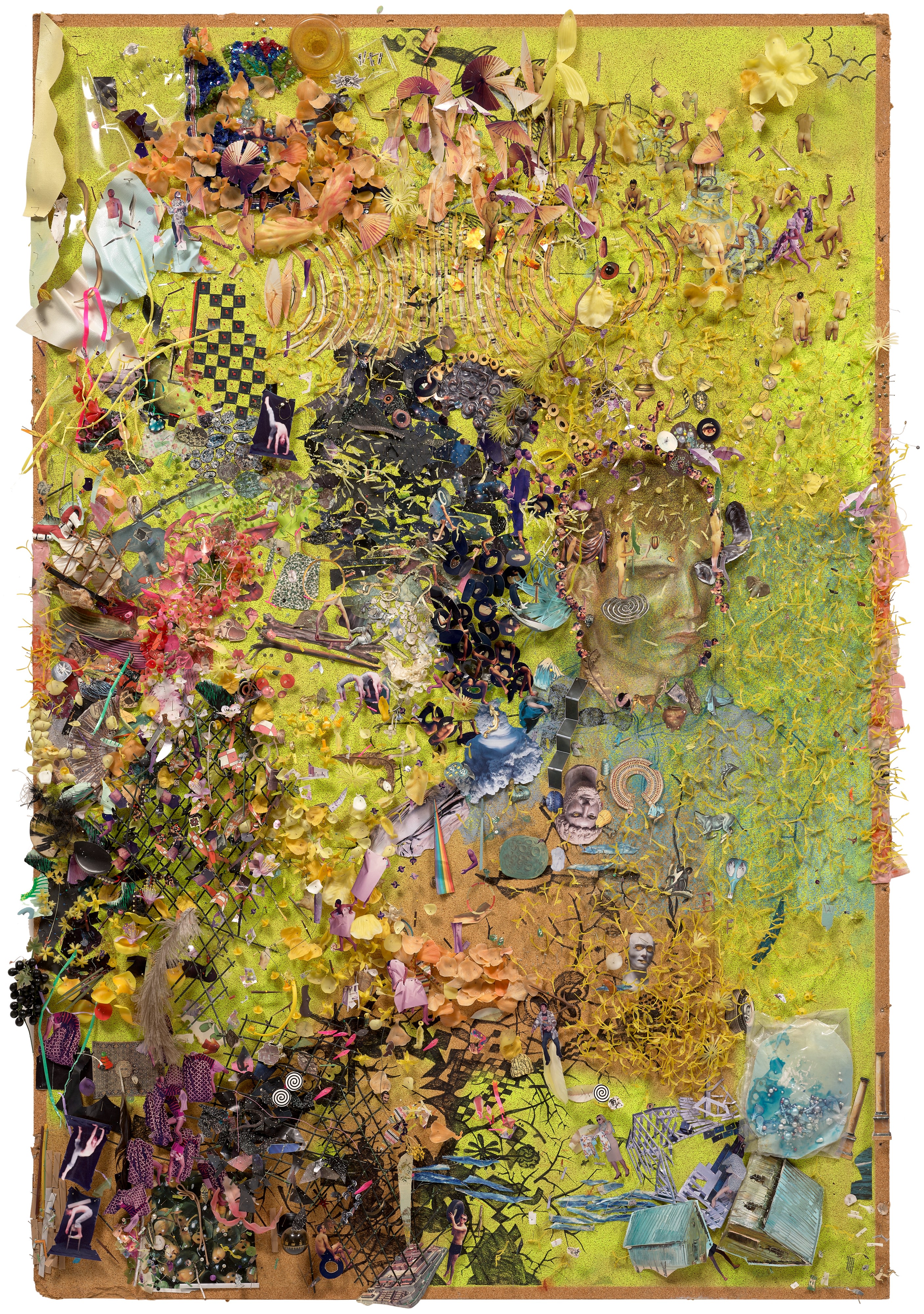 found objects, photo collage, pins, canvas, sequins, pastel, marker and mixed media on cork mounted to foamcore