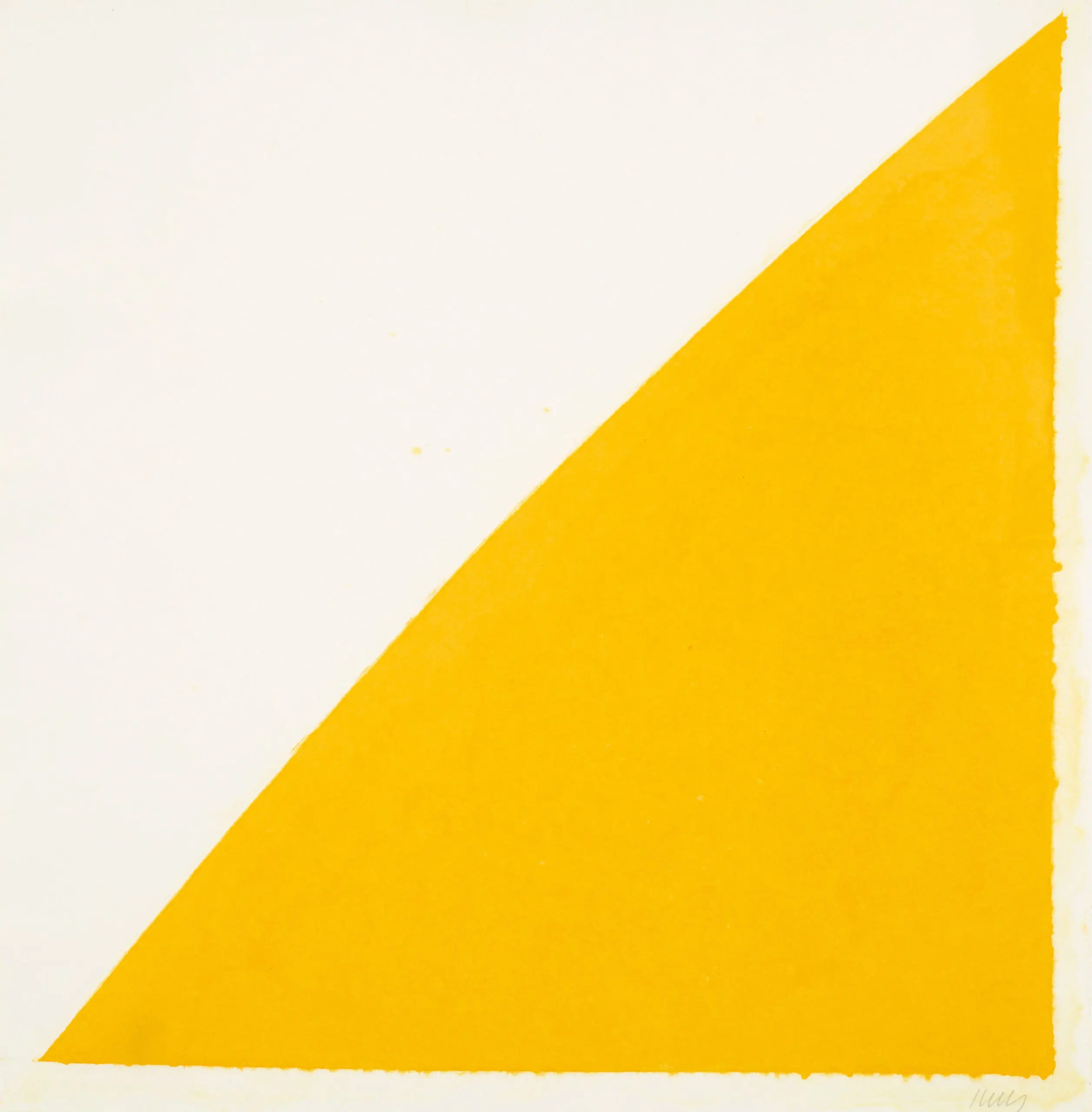 A striking minimalist work from Ellsworth Kelly's groundbreaking Colored Paper Image series, featuring a bold yellow triangular form against a white ground. Created using hand-pressed paper pulp at HMP Paper Mill in collaboration with master printer Kenneth Tyler, this piece exemplifies Kelly's mastery of color, form, and innovative printmaking techniques. Part of a limited edition of 24 plus proofs, published by Tyler Graphics Ltd., and catalogued as Axsom 154. Signed and numbered by the artist in pencil in the lower margin.