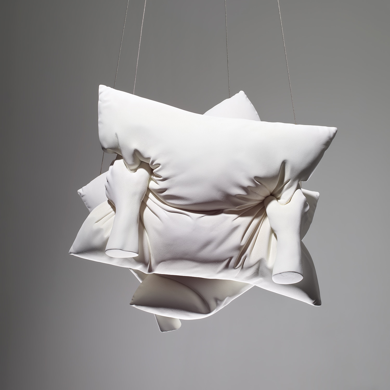 Elmgreen & Dragset's sculptural work combines plaster, acrylic, and steel cables to explore themes of human emotion and physical form. The piece juxtaposes contrasting states through its title, suggesting the duality of human experience.