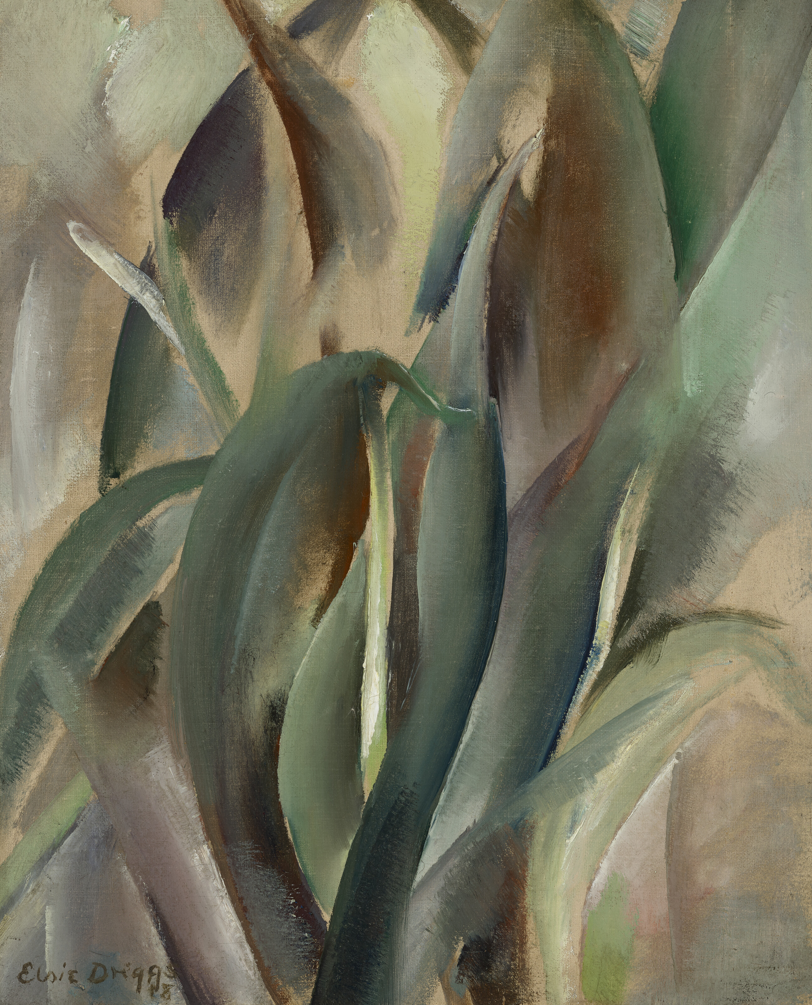 Elsie Driggs's abstract work exploring organic botanical forms through modernist composition. The painting reflects her interest in natural forms translated into geometric and dynamic visual structures.