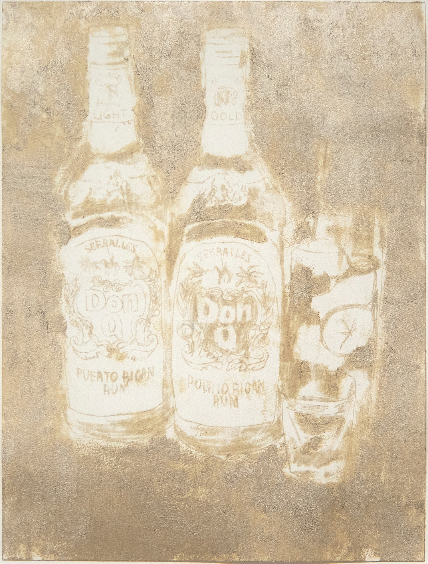 Enoc Pérez's 2007 oil painting on paper titled 'Don Q' likely references Don Quixote or the rum brand, rendered in the artist's characteristic style. The work explores themes through portraiture or still life using traditional oil painting techniques.