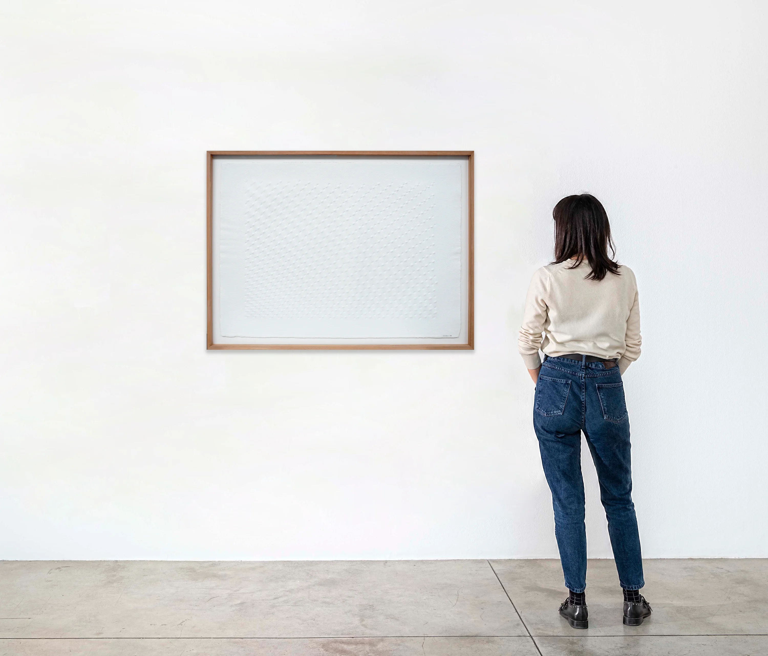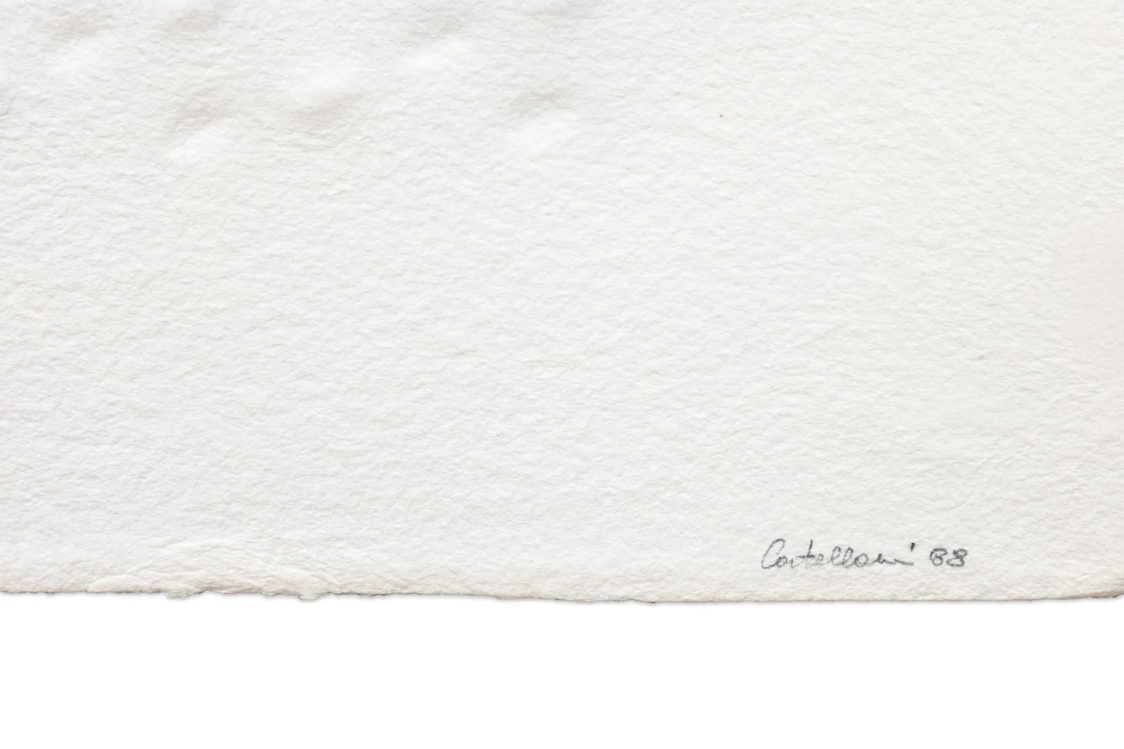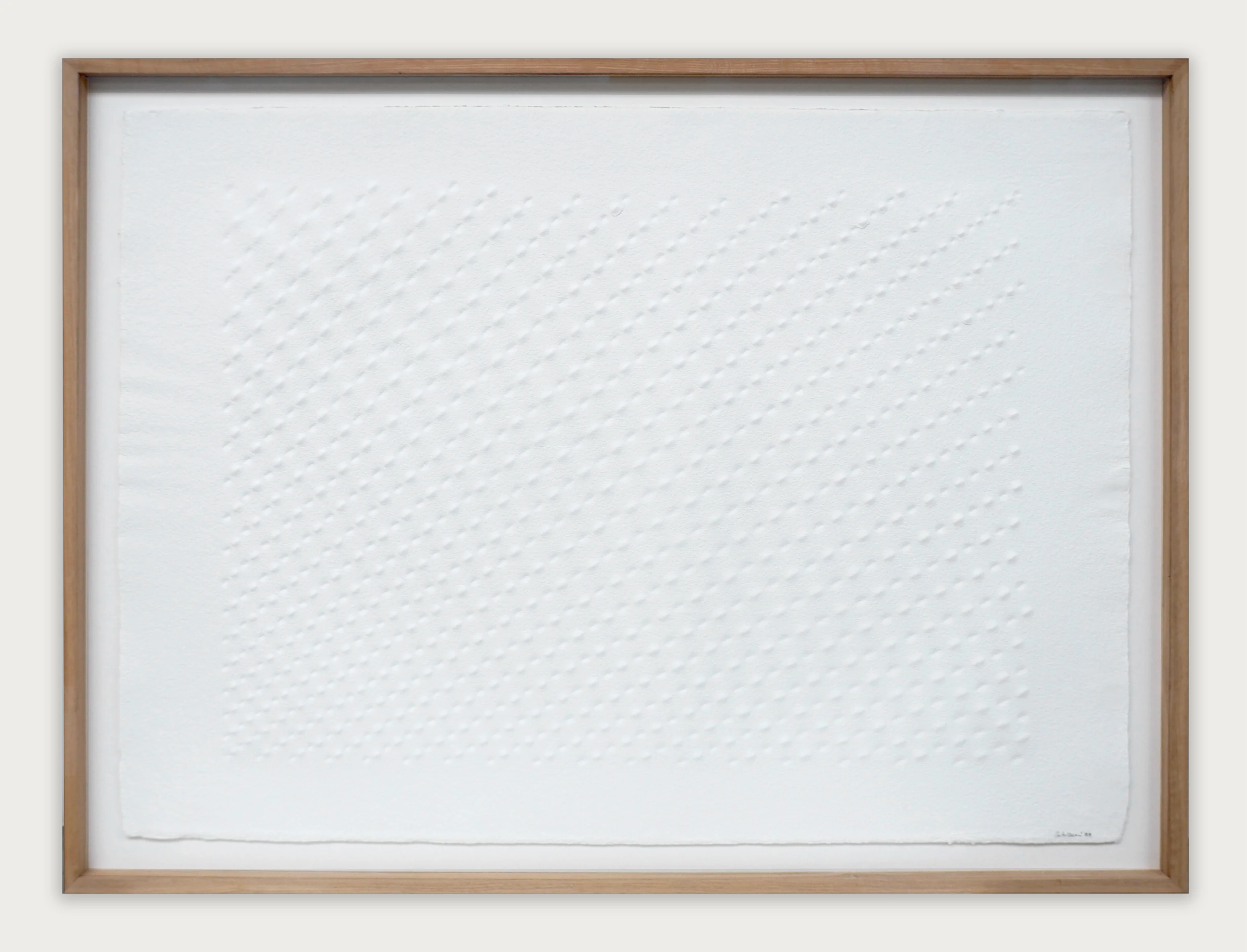 This embossed paper work explores the tension between surface regularity and infinite depth through monochromatic relief. Castellani's rhythmic surface patterns create a meditative visual field that invites sustained contemplation. The artist seeks to capture the paradox of infinity through concrete, tactile materiality. The work reflects his philosophy that abstract surfaces without imagery open pathways to profound aesthetic experience. This piece exemplifies the artist's lifelong investigation of how physical surface can evoke boundless conceptual space.