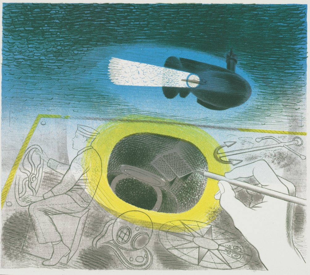 Part of Ravilious's wartime commission documenting naval operations, the lithograph demonstrates his ability to find beauty and pattern in military subjects through his characteristic precise, decorative style.
