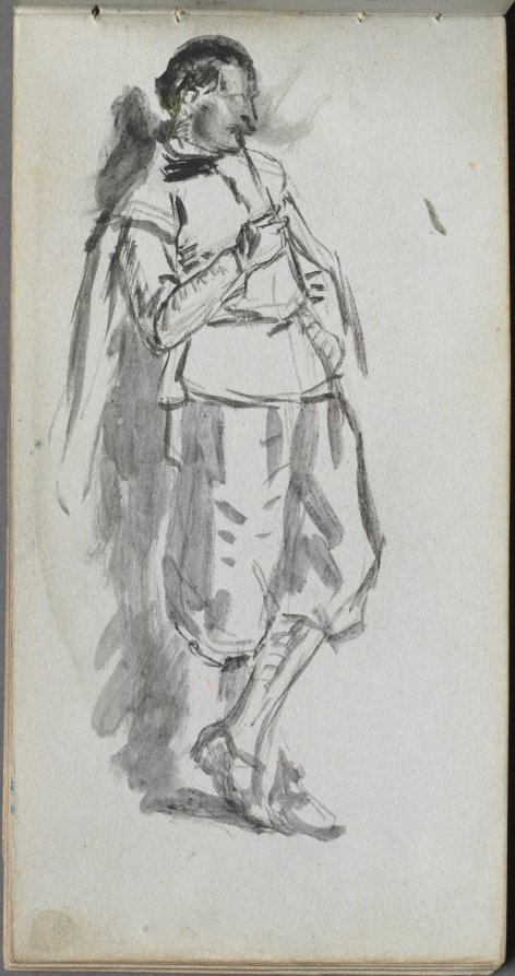 This sketch by Ernest Meissonier demonstrates the artist's masterful command of figure drawing through a combination of graphite, pen, ink, and wash. The work showcases his classical training and attention to anatomical precision, capturing the standing pose with economical yet confident linework. As a study from Meissonier's sketchbook, the page reveals the working methods of a 19th century academic artist who was celebrated for his meticulous historical paintings and military scenes.