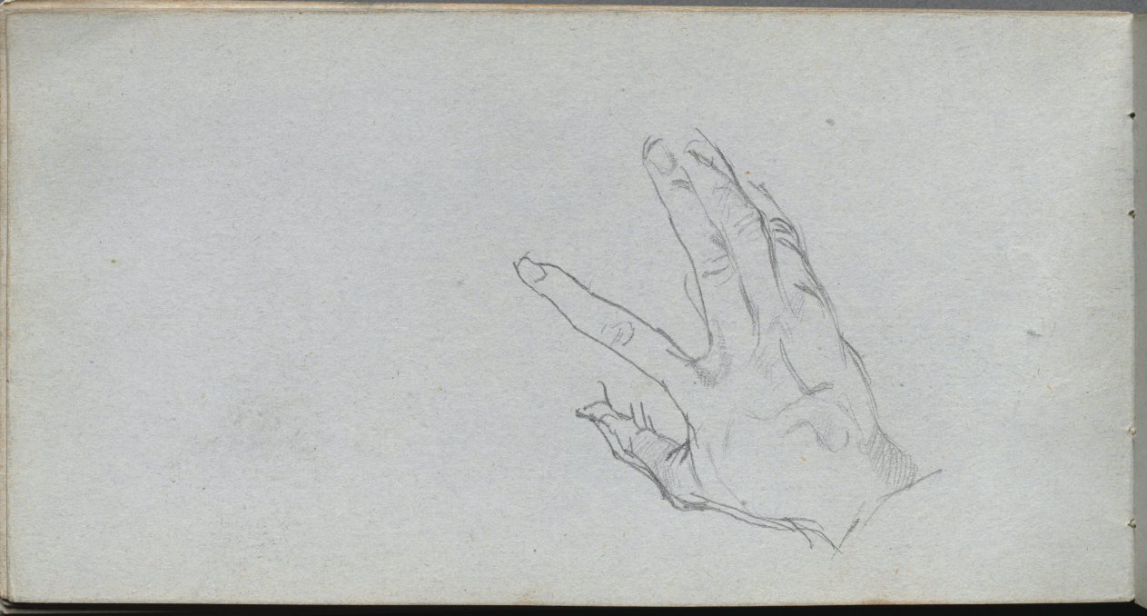 This graphite study demonstrates Meissonier's meticulous attention to anatomical detail and form, characteristics that defined his reputation as a master draftsman of the 19th century. The delicate rendering of light and shadow across the hand's surface reveals the artist's technical precision and his commitment to understanding human anatomy through careful observation. As a page from his working sketchbook, this study exemplifies the rigorous preparatory practices that Meissonier employed before executing his finished paintings.