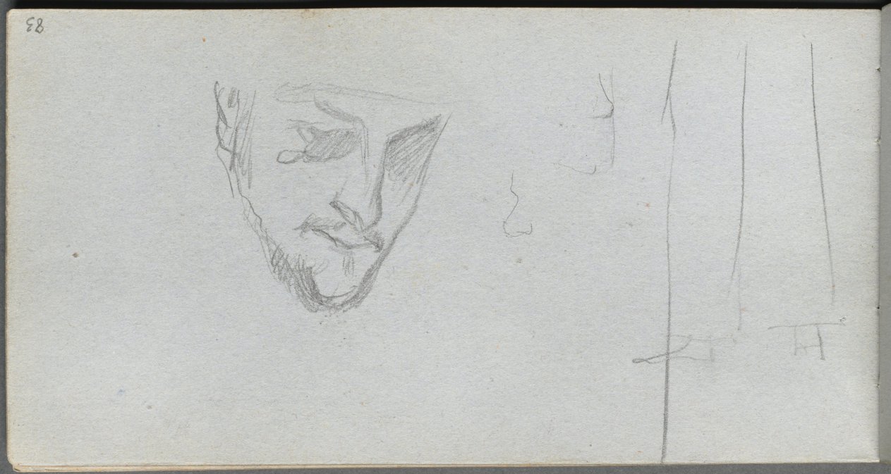 This graphite study by Ernest Meissonier demonstrates the French academic artist's meticulous approach to figure drawing through carefully rendered anatomical studies. The page exhibits his characteristic technical precision, with particular attention devoted to capturing facial features and the musculature of the lower extremities. Such preparatory sketches were essential to Meissonier's working method, serving as foundational studies for his larger historical and genre compositions.