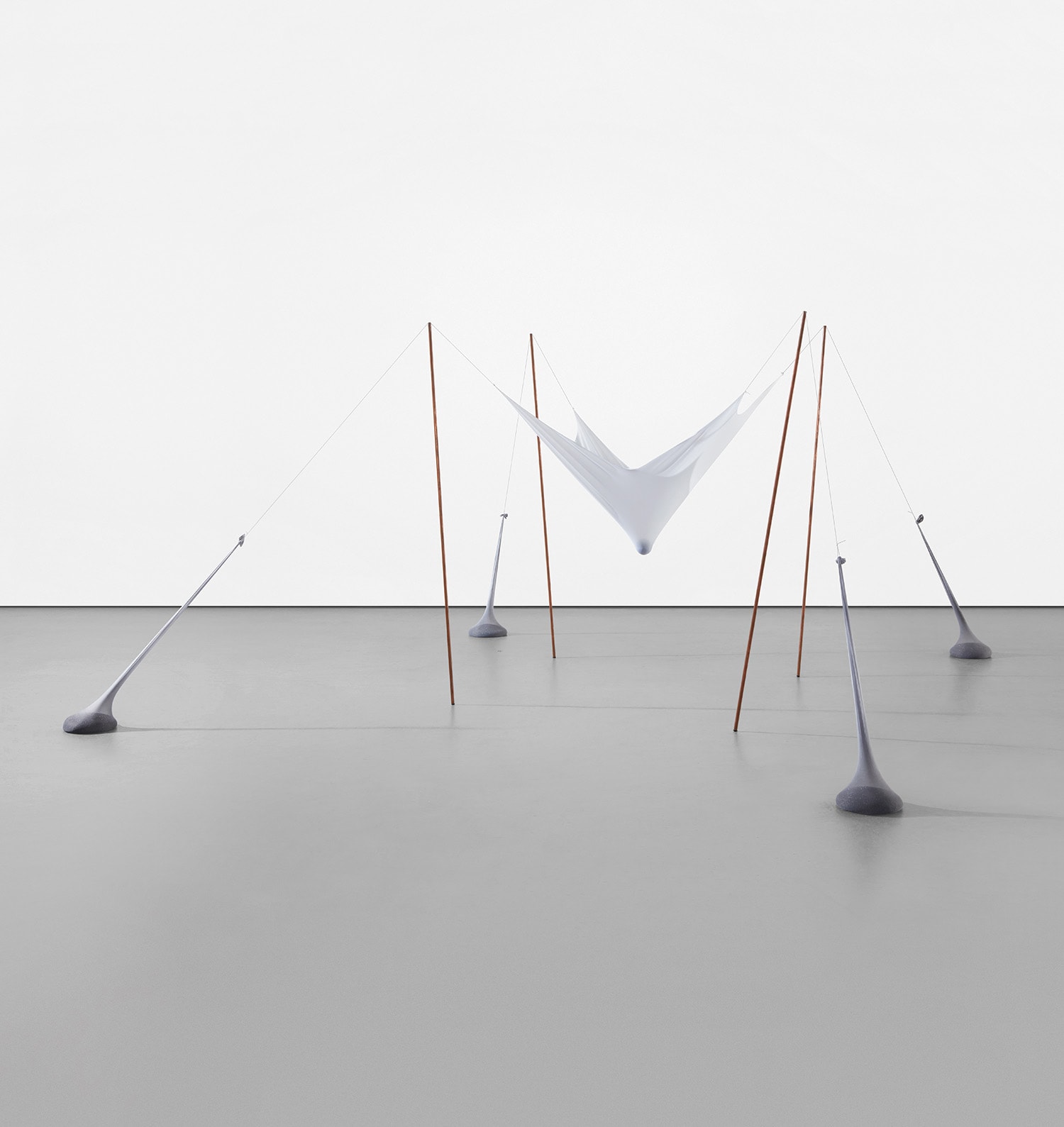 Ernesto Neto's 'Topologic fluency on a structural camp for high density point' from 1992 explores mathematical and spatial concepts through three-dimensional form. The work represents the artist's interest in merging scientific principles with artistic practice.