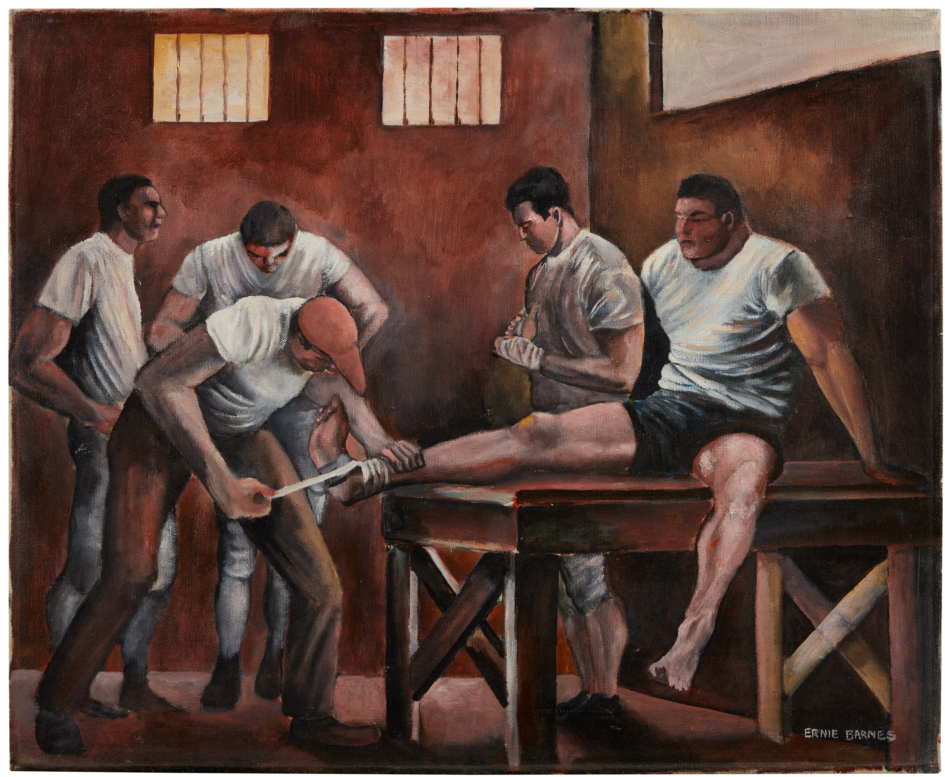 "Dressing Room" by Ernie Barnes is an acrylic painting that captures an intimate moment of preparation, showcasing Barnes's characteristic style of elongated, graceful figures rendered with warm, luminous colors. The work exemplifies his ability to depict African American subjects with dignity and elegance, celebrating everyday moments of personal care and self presentation. Barnes's fluid brushwork and dynamic composition transform a simple domestic scene into a study of form, movement, and human vulnerability.