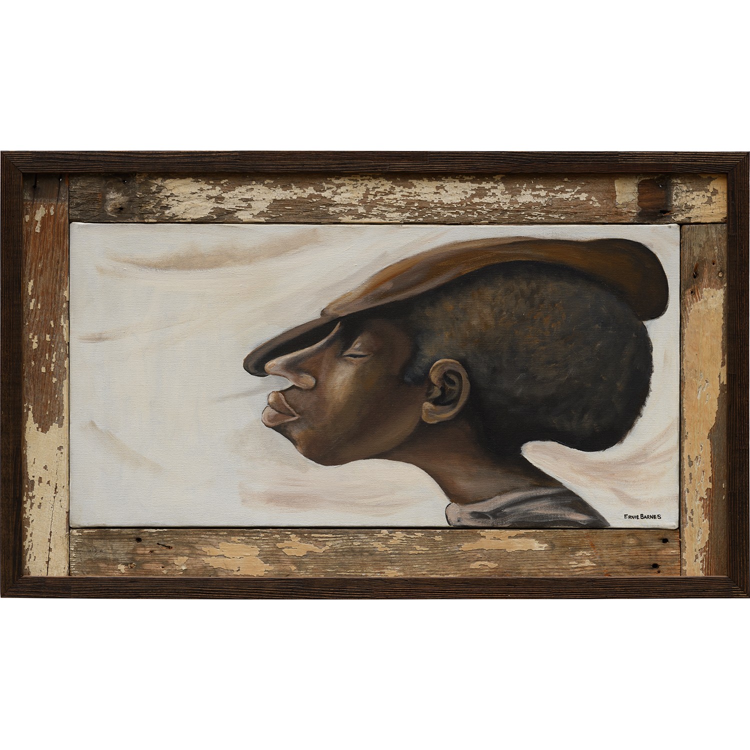 Ernie Barnes's 'My Man' from 1980 is an acrylic on canvas work presented in the artist's custom frame, celebrating African American culture and identity. The painting demonstrates Barnes's distinctive narrative style and celebration of human dignity.