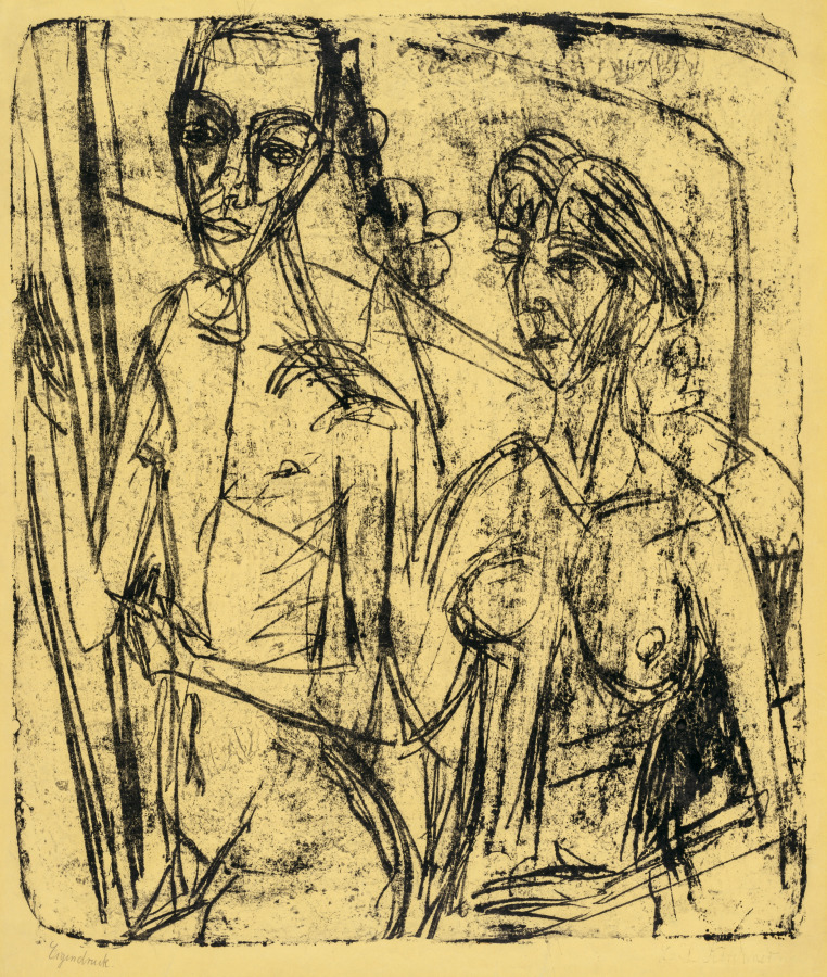 Printed on yellow paper, Kirchner's intimate domestic scene exemplifies the Die Brücke group's interest in unidealized human relationships and expressive printmaking techniques.